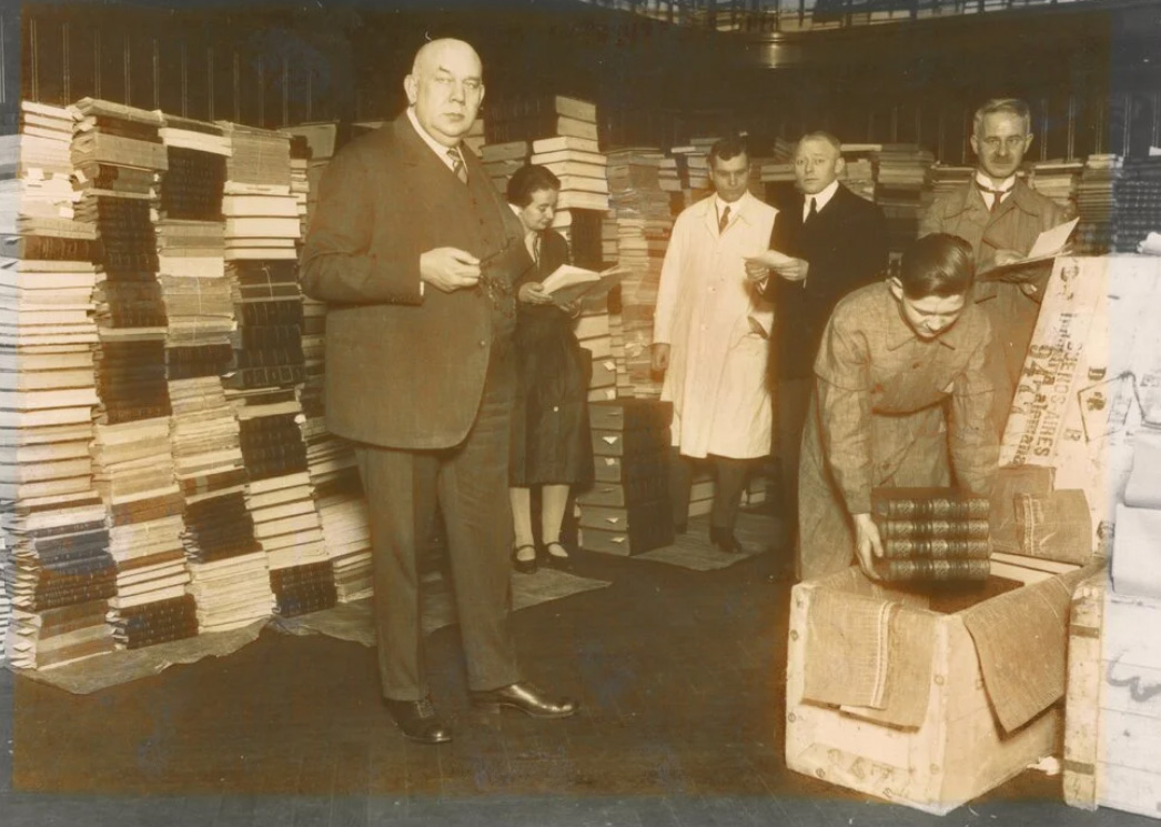 Otto Boelitz, primer director del Instituto Iberoamericano de Berlín, y sus colaboradores desembalan la biblioteca Quesada. Fotografía: Gentileza Ibero-Amerikanisches Institut.