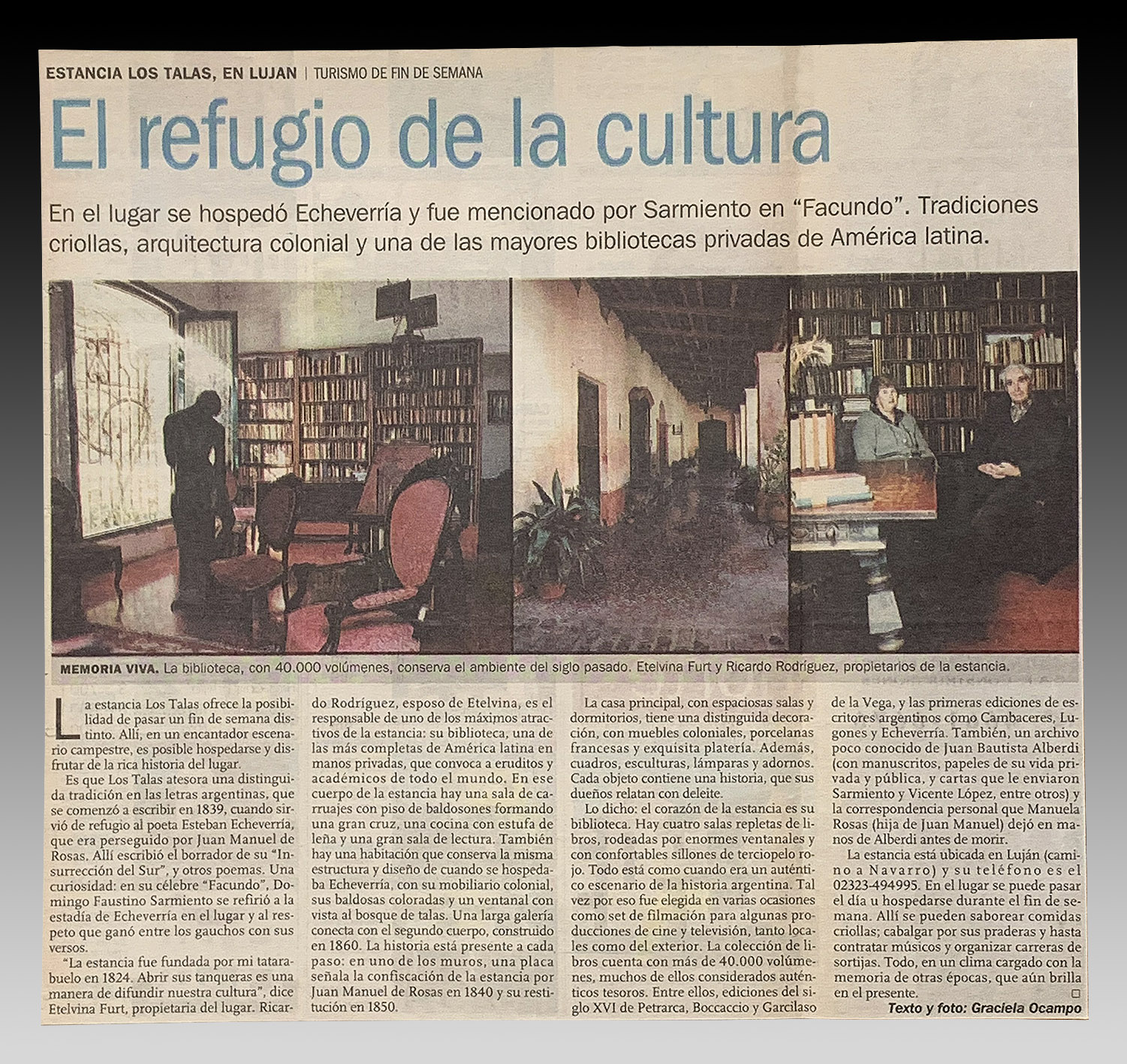 Allá lejos, hace tiempo: La posibilidad de visitar la estancia «Los Talas», una alternativa entre la naturaleza y los libros. En el diario La Nación, del 23 de enero de 1999.