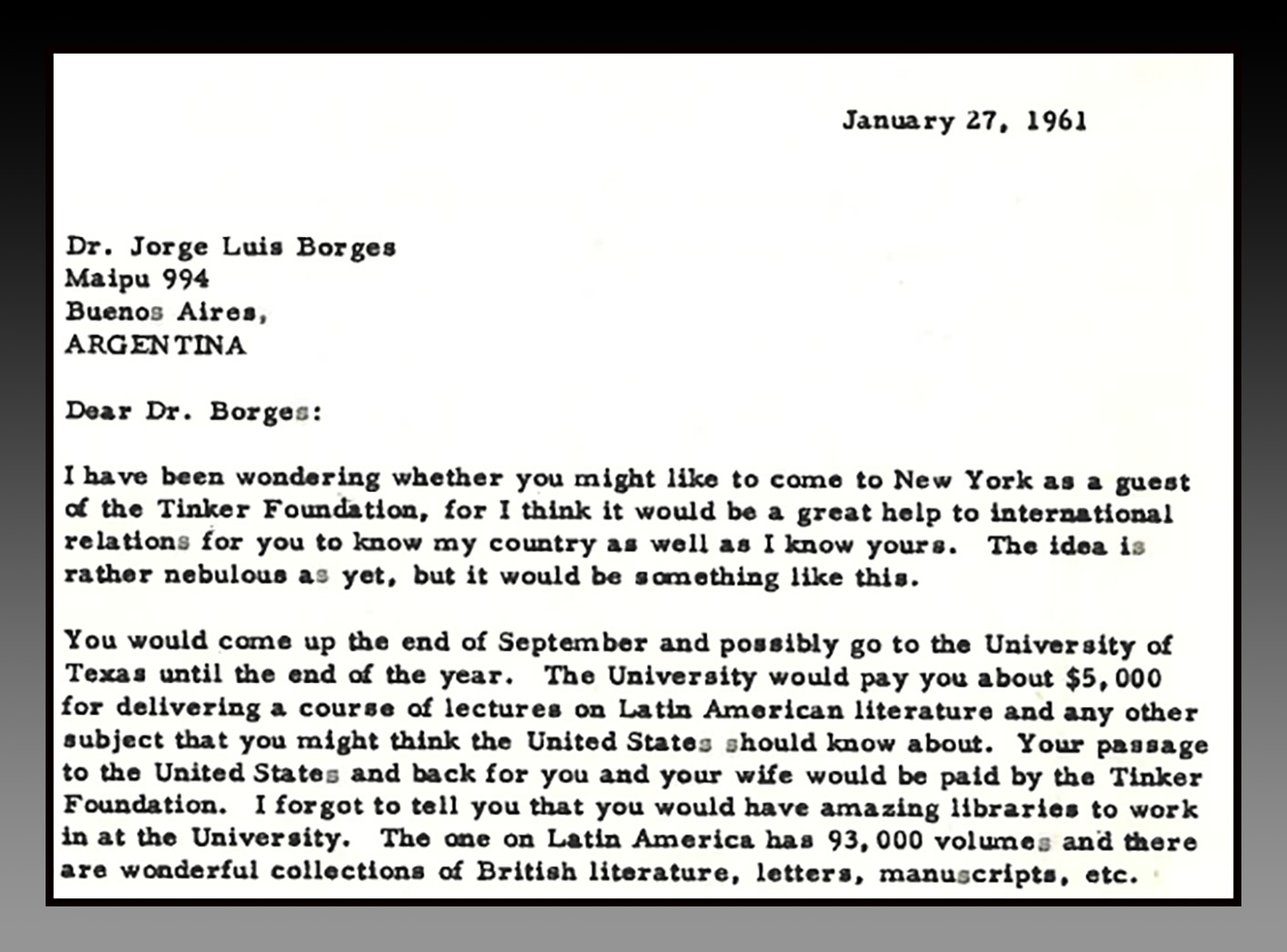 10] En el Archivo Tinker se conserva copia de la carta personal que Larocque Tinker remitió en enero de 1961 a Jorge Luis Borges invitándolo a dar conferencias en Universidad de Texas, ante un público de 500 alumnos, considerándolo como el primer Profesor Visitante invitado. La Universidad se hacía cargo del honorario de 5.000 dólares y la Fundación Tinker de los pasajes de ida y vuelta y gastos de estadía para Borges y acompañante.