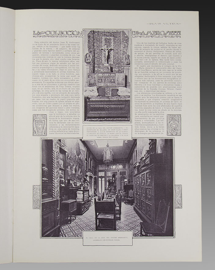 La casa de Ambrosetti abrió sus puertas en 1917 a un cronista de la reconocida revista Plus Ultra [3] y varias imágenes fotográficas tomadas en la oportunidad permiten observar numerosas piezas de arte colonial, como el lienzo del milagro de la Virgen del Sunturhuasi, un contador altoperuano y obras procedentes de las misiones jesuíticas, adquiridas en sus viajes de relevamiento por el norte del país.