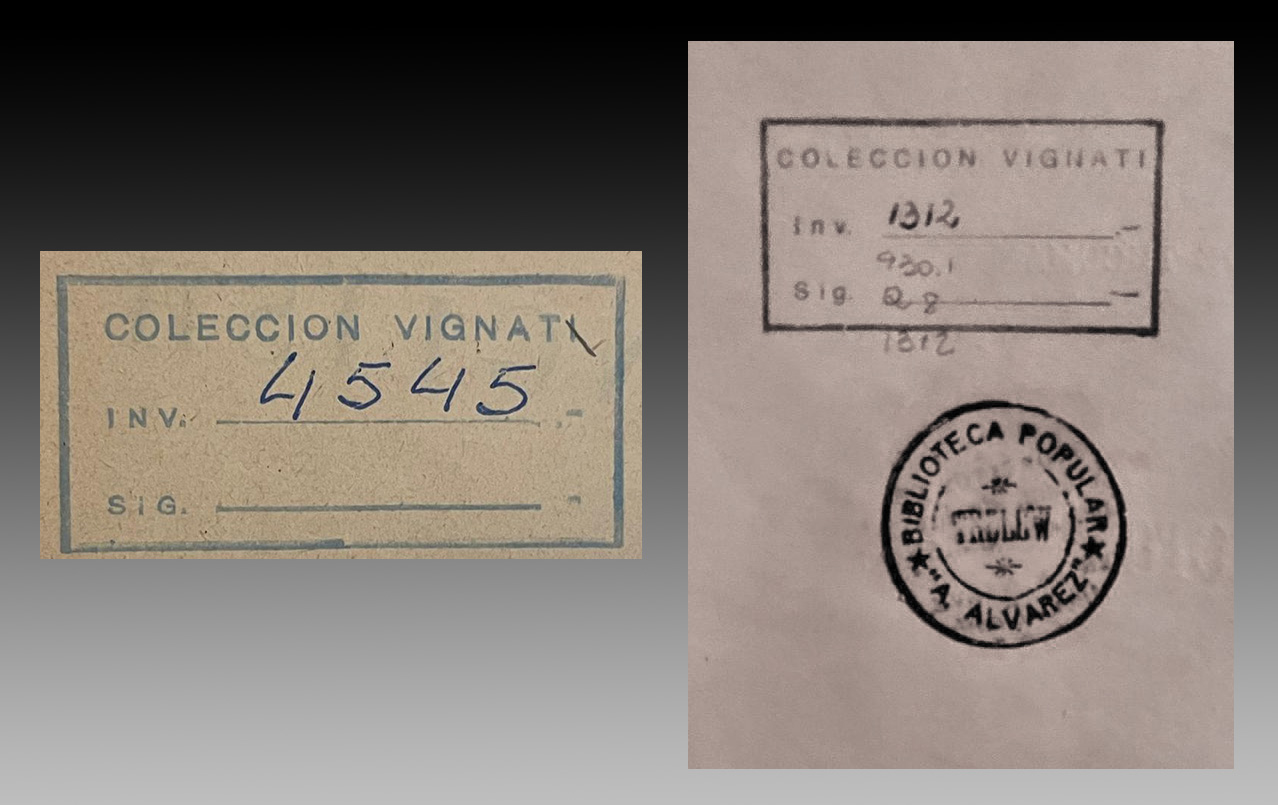 El lapso que va desde sus inicios en el coleccionismo y su muerte, coincide con el  período en que se dispersaron numerosas bibliotecas de coleccionistas de renombre, como, entre las que recuerdo, las de: Estanislao S. Zeballos; Francisco P. Moreno; Alberto Dodero [en Londres]; Clemente L. Fregeiro; Jorge A. Gardner; Matías Errázuriz; Natalio Botana; Oscar Carbone; Raúl Rosarivo; Teodoro Becú; Jorge Beristayn; Antonio Santamarina; Enrique Arana [h]; Eduardo J. Bullrich; Pedro N. Arata [2]; Carlos A. Pueyrredón; Guillermo Kraft y Lorenzo R. Parodi; enumeradas sin orden cronológico [3]. Es muy factible, y hasta esperable, que Vignati haya comprado ejemplares en más de una de dichas oportunidades, como así también que hiciese canjes con otros coleccionistas de forma regular. Todas estas circunstancias dificultan la posibilidad de determinar la secuencia de propietarios sucesivos de un libro, sin embargo, en algunos pocos casos ha quedado algún registro o indicio al respecto.