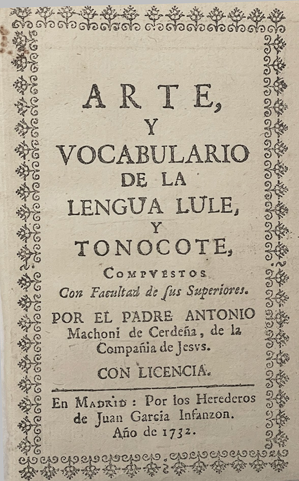 Machoni, A.: Arte, y Vocabulario de la lengua Lule, y Tonocote, [...] Madrid: Por los Herederos de Juan García Infanzón, 1732. Será posible apreciar este ejemplar en el stand 11 [Librería Armando Vites, de Rosario], en la 18ª Feria del Libro Antiguo de Buenos Aires.