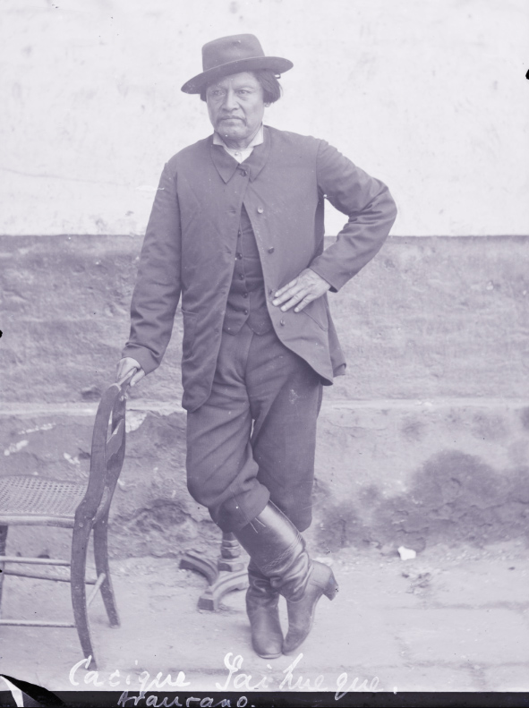 Vignati estudia la «amplia serie de negativos» existente en el archivo del Departamento de Antropología para escribir su Iconografía aborigen [...] publicada en el Tomo II de la Revista del Museo de la Plata, Nueva Serie, Antropología, N° 10. Vemos aquí al cacique Sayhueque en un retrato tomado por Samuel Boote en el Tigre, circa 1885-1886, reproducido en la lámina X de aquella obra. Fotografía: Archivo Histórico del Museo de La Plata, negativo ARQ-002-011-0006.