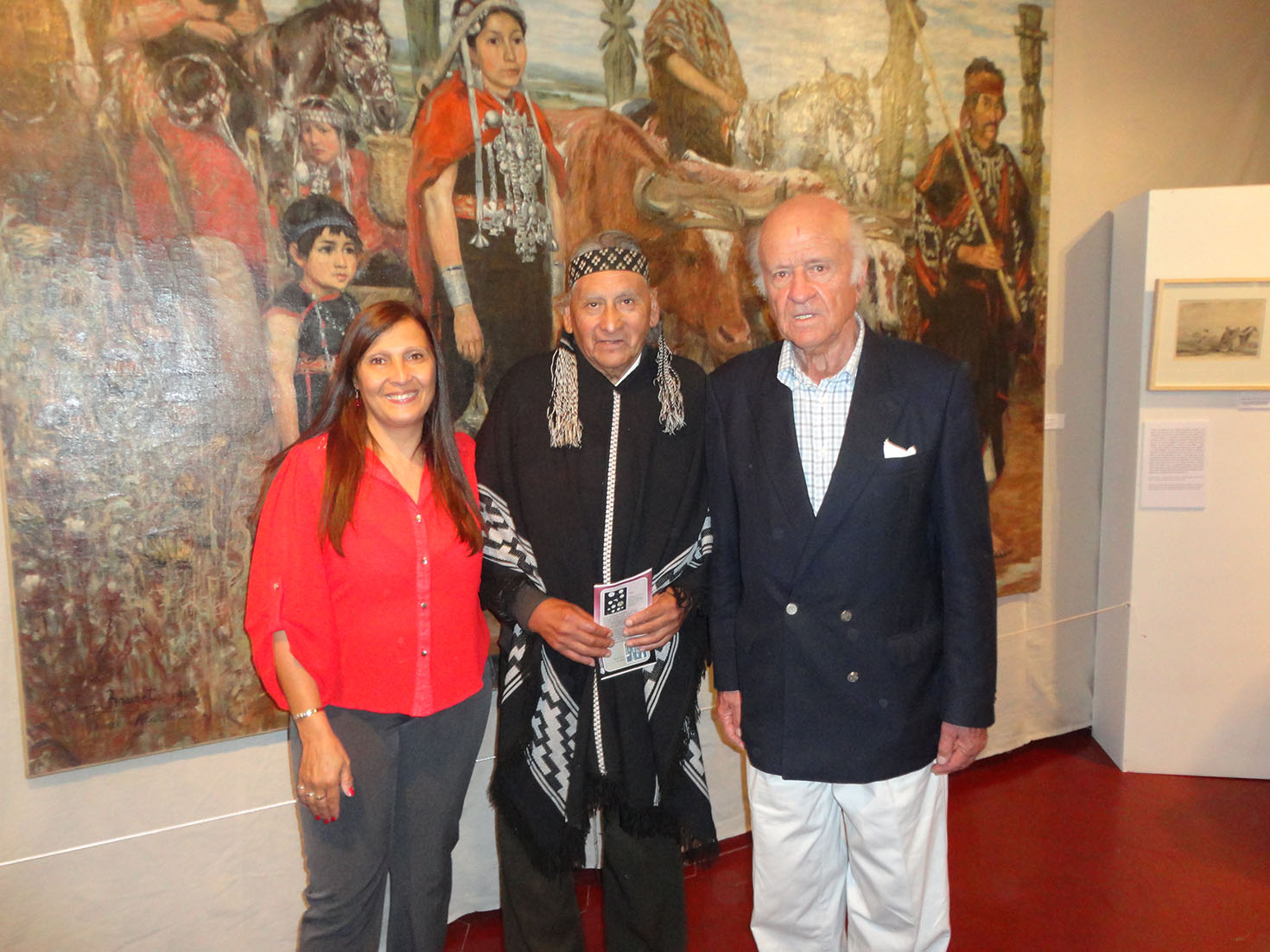 Podía observarse al final del salón, un cuadro al óleo, de grandes dimensiones, titulado «Temuco en Araucanía», de Richon-Brunet [2], representaba a un grupo de mujeres mapuche, con sus vestimentas y alhajas características, una de ellas en primer plano. Dicha tela servía de fondo a una escena montada con maniquíes vestidos con ponchos, fajas, chamales y otros objetos propios del contexto.