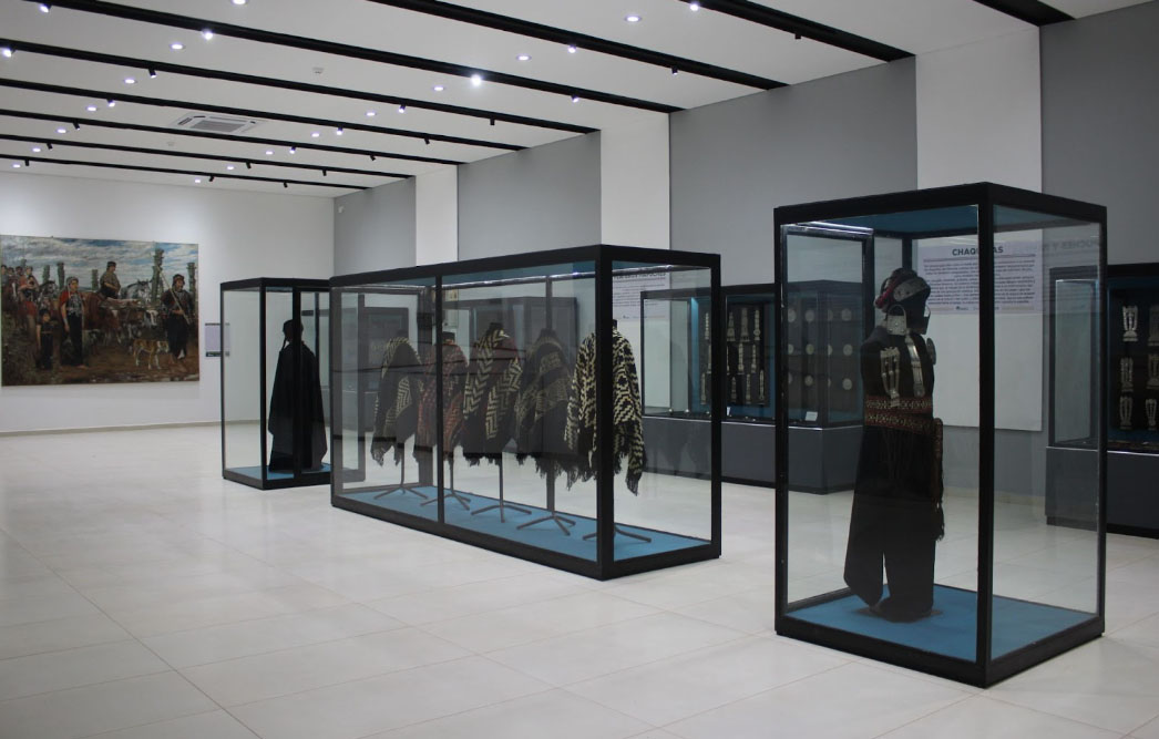 Vitrinas con la platería y textiles mapuche, en la sala construida y equipada para albergar este patrimonio. Fotografía: Inés Maya.