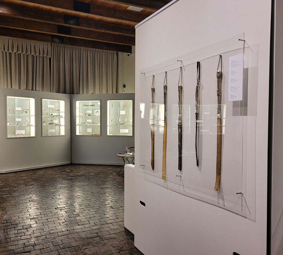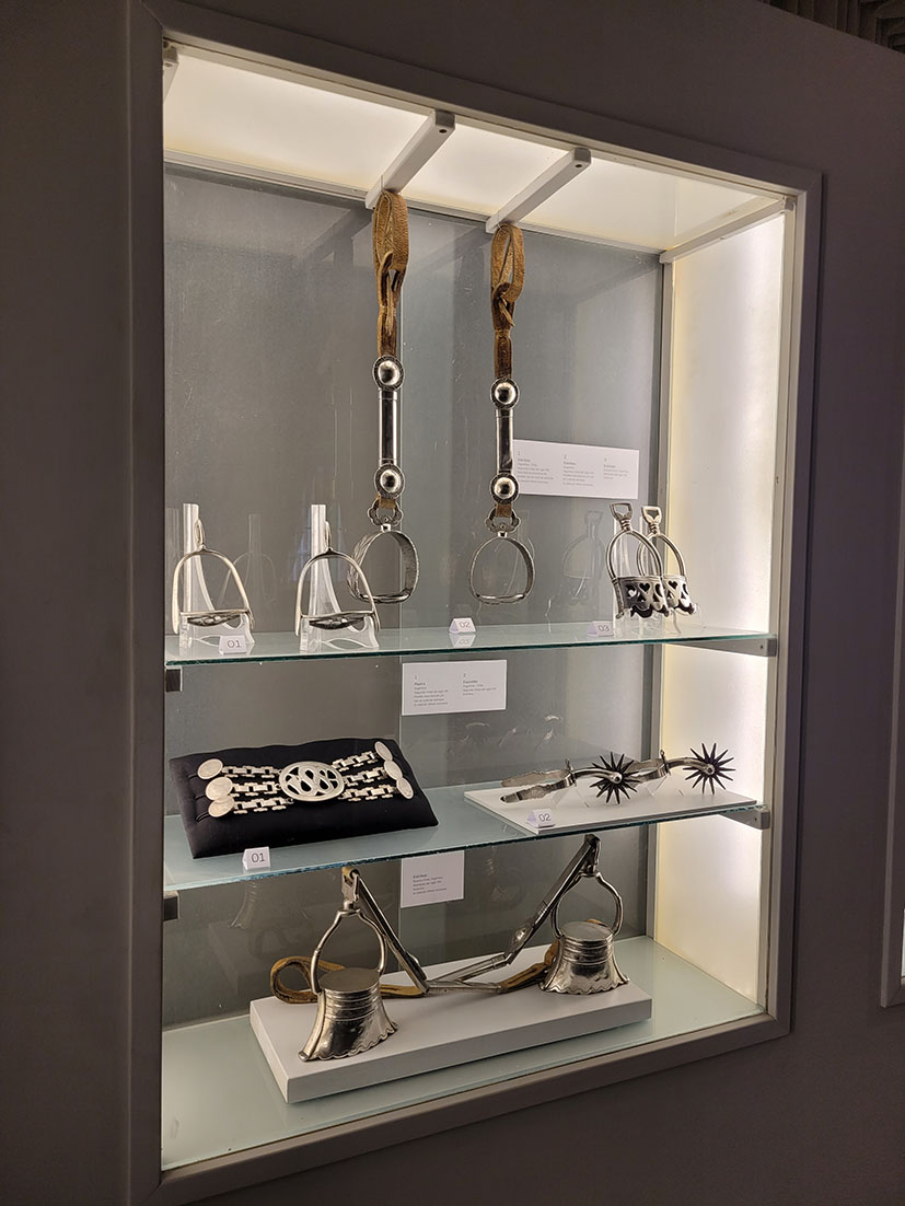 Obras de carácter religioso y de uso civil; espuelas, estribos, cabezadas, riendas, frenos, fiadores, rebenques, rastras, cuchillos, mates, jarros… y el ajuar femenino de las nativas pampas y araucanas, son verdaderos testimonios de identidad y de dominio de un oficio. Poco más de un centenar y medio de piezas dialogan a través de los tiempos y los espacios geográficos. Algunas identificadas por la marca de su autor y las más, nacidas en esas manos anónimas que se curtieron a golpe de martillo, replicando un sentir estético heredado y celosamente preservado.