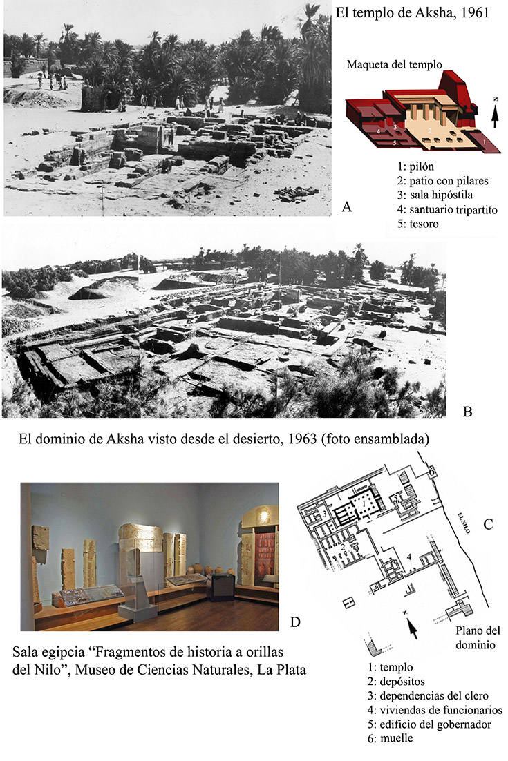 2] Son unas 50 piezas que provienen del templo y de estructuras económicas y administrativas del dominio, integradas por elementos arquitectónicos, estelas reales y de particulares, y de piezas de cerámica. La primera sala de exhibición se montó en 1977 siguiendo el criterio que reproducía la ubicación que tenían las piezas en el dominio de Aksha y con dibujos a escala natural las faltantes, criterio propuesto por Rosenvasser y ejecutado con la colaboración académica de Alicia Daneri y mía, y con la colaboración técnico del personal del Museo. La segunda se llevó a cabo en 2013 en una nueva sala, «Fragmentos de historia a orillas del Nilo», que sigue un criterio temático, con mi asesoramiento académico a los curadores.