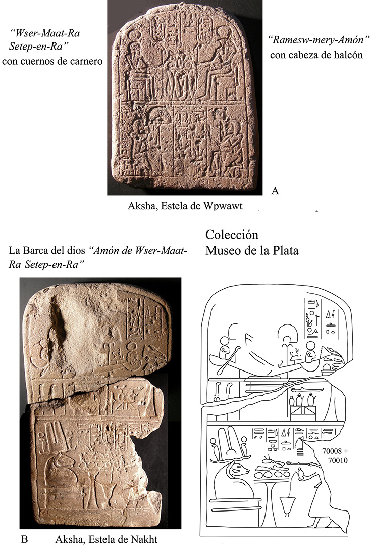 La otra estela de Aksha (Fig. 3, B) es la del «sacerdote Nakht» que presenta ofrendas a Amón representado como un carnero. En la parte superior está la barca procesional sobre un pedestal, la barca del dios «Amón de Wser-Maat-Ra Setep-en-Ra» [21], que tiene en la proa y la popa una figura divina con cuernos de carnero y el disco solar. Sin duda es la barca de madera que estaba en la sala hipóstila -o sala de la barca- [22], barca que se sacaba del templo durante las festividades para que el dios fuera adorado por los fieles. Es la única representación que se conoce hasta el presente de la barca del dios Ramses en un documento particular.