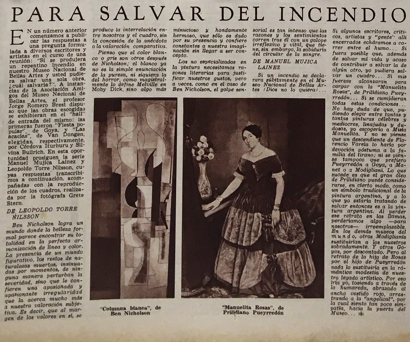 La relación entre destrucción y cultura fue fijada con nitidez en la obra de Walter Benjamin. De forma más particular, la idea de que el libro pueda conservar de otro modo lo que se llevaron las llamas, evoca vívidamente algunas de las imágenes más recordadas de este autor en torno al lugar decisivo del conflicto y de la contingencia en la transmisión de la cultura. En Argentina, la pregnancia cultural de la imagen de un museo en llamas tenía un antecedente que merece ser anotado: en el año 1963, el diario porteño La Nación había presentado a sus lectores, en una serie de entregas, una columna que se tituló “Para salvar del incendio”. Desde ese espacio se preguntaba a distintos críticos de arte qué obras salvarían del museo en caso de que se desate una catástrofe ígnea. En la entrega del 3 de septiembre, por ejemplo, fue entrevistado Manuel Mujica Lainez. El novelista sostuvo que rescataría el retrato de Manuelita Rosas: «el gran óleo de Prilidiano, puede considerarse, en cierto modo, como símbolo tradicional de la pintura argentina, y a lo que ya estaría tratando de salvar entonces es a la pintura argentina».