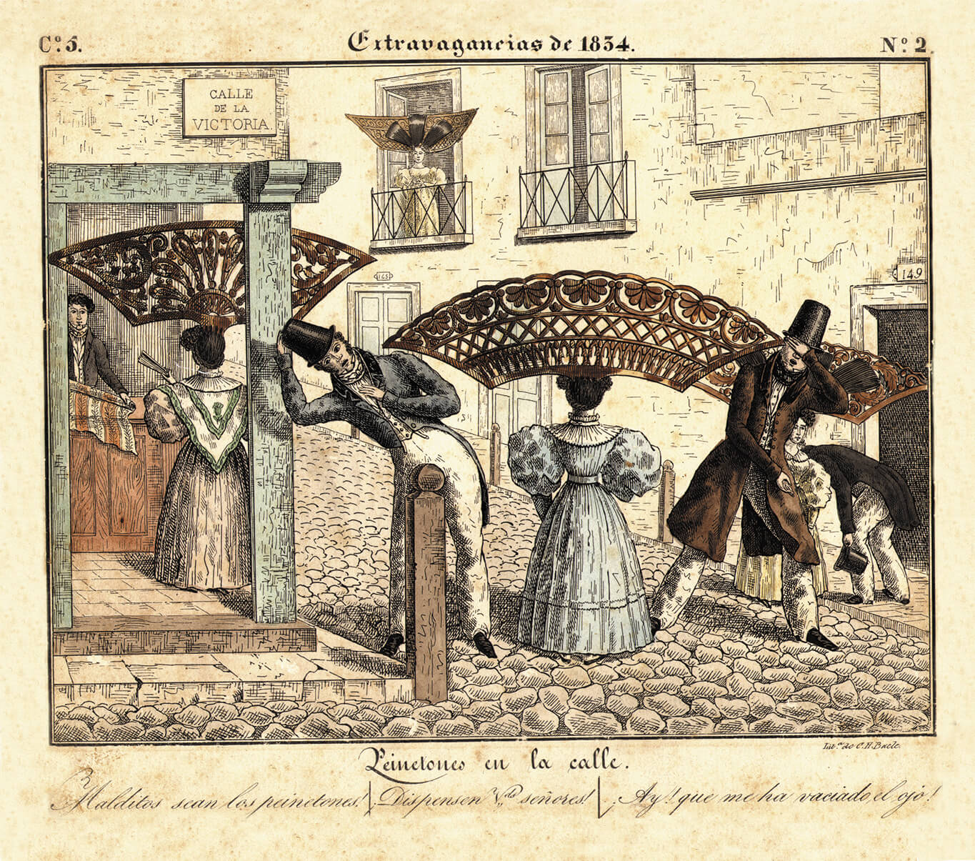 Su desmesura fue acompañada, proporcionalmente, por el crecimiento de las mangas farol y el vuelo de las faldas, ampliado con múltiples capas de enaguas superpuestas, y que transformaron a las damas en verdaderos relojes de arena ambulantes. Matronas y damitas se registraron en las litografías de César Hipólito Bacle, en los retratos acuarelados de Charles Henri Pellegrini o en las miniaturas de Jean-Philippe Goulu, luciendo orgullosas el novedoso peinetón. Acicaladas con peinados caprichosos, capaces de soportar el peso de una compleja arquitectura sobre sus cabezas, todas ellas fueron la muestra cabal de una sociedad de comerciantes devenida en ganaderos, deseosa de reafirmar su posición con un sello extravagante y evidenciar su crecimiento económico.