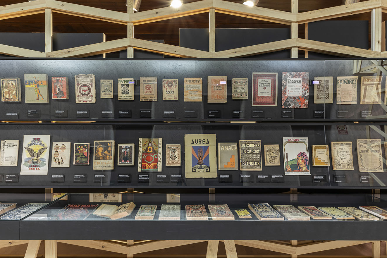 Reinterpretación e identidad (1910-1940): en esta sección se reúnen obras en las que se manifiesta el rol del pasado prehispánico en la consolidación de una modernidad nacional. Reviste particular interés la puesta en evidencia de: la relevancia de las artes aplicadas en este período (diseño gráfico, textil, joyería, mobiliario, cerámica), la proyección del rescate modernista de lo autóctono en la educación escolar y la presencia de temática y estética prehispánica en el teatro, el cine y la música, de lo se da testimonio a través de fotografías, discos, afiches, etc.