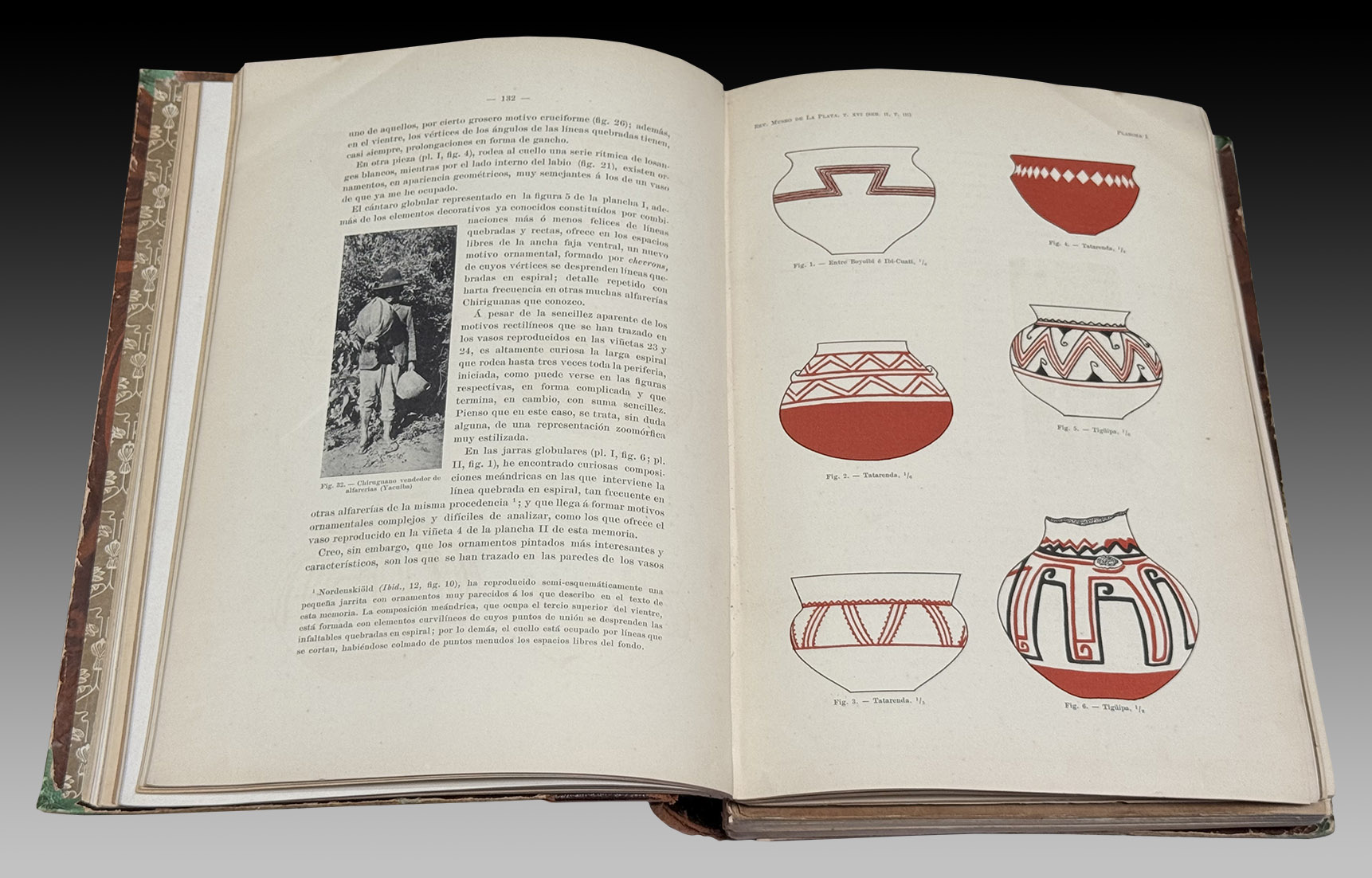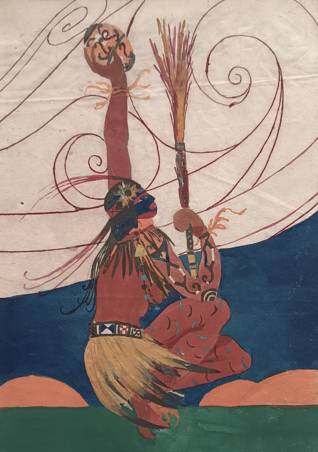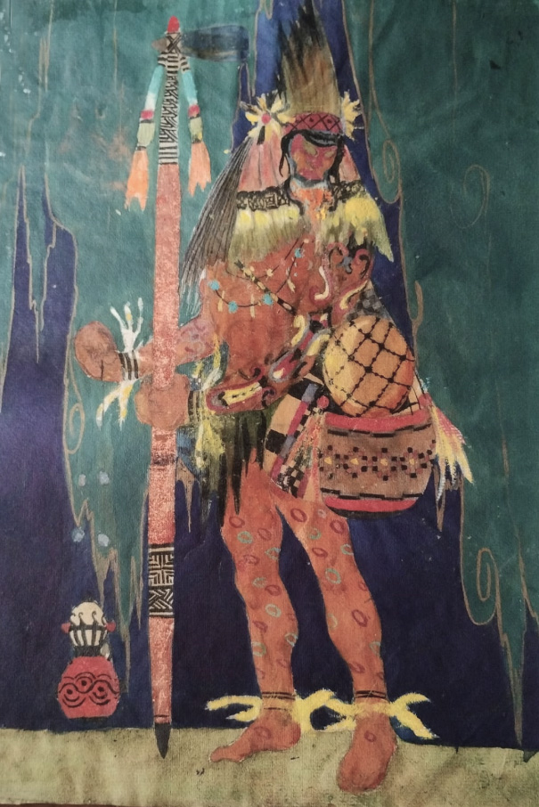 En el primer caso, se trata de una deriva de las investigaciones sobre las leyendas del Urutaú y del Caaporá, conocidas por los relatos de Juan Bautista Ambrosetti, entonces director del Museo Etnográfico de Buenos Aires. Esto les brindó la ocasión de consultar fuentes iconográficas y documentales sobre mitos y relatos del amplio universo guaraní, vitales para la realización de su proyecto. Es posible que, entre las fuentes consultadas, hayan accedido a la obra de Félix F. Outes, quien en 1908 publicó un estudio titulado La cerámica chiriguana, donde presenta un minucioso detalle de las formas decorativas geométricas recolectadas por Eduardo Alejandro Holmberg. En este conjunto, las figuras de los personajes del ballet exhiben trajes y ornamentos inspirados en tocados plumarios, faldas con flecos, cuerpos pintados y motivos propios de las comunidades caduvea y mundurukú, que revelan un cruce entre tradición indígena y modernidad pictórica. Son claras, además, las influencias de los Ballets Russes y las audacias estilísticas de su maestro juvenil en París, el artista catalán Hermenegildo Anglada Camarasa. Cabe recordar que el proyecto interesó al bailarín ruso Nijinsky durante su presentación en el Teatro Colón en 1917, quien a su vez habría entusiasmado a Igor Stravinsky para la composición musical.