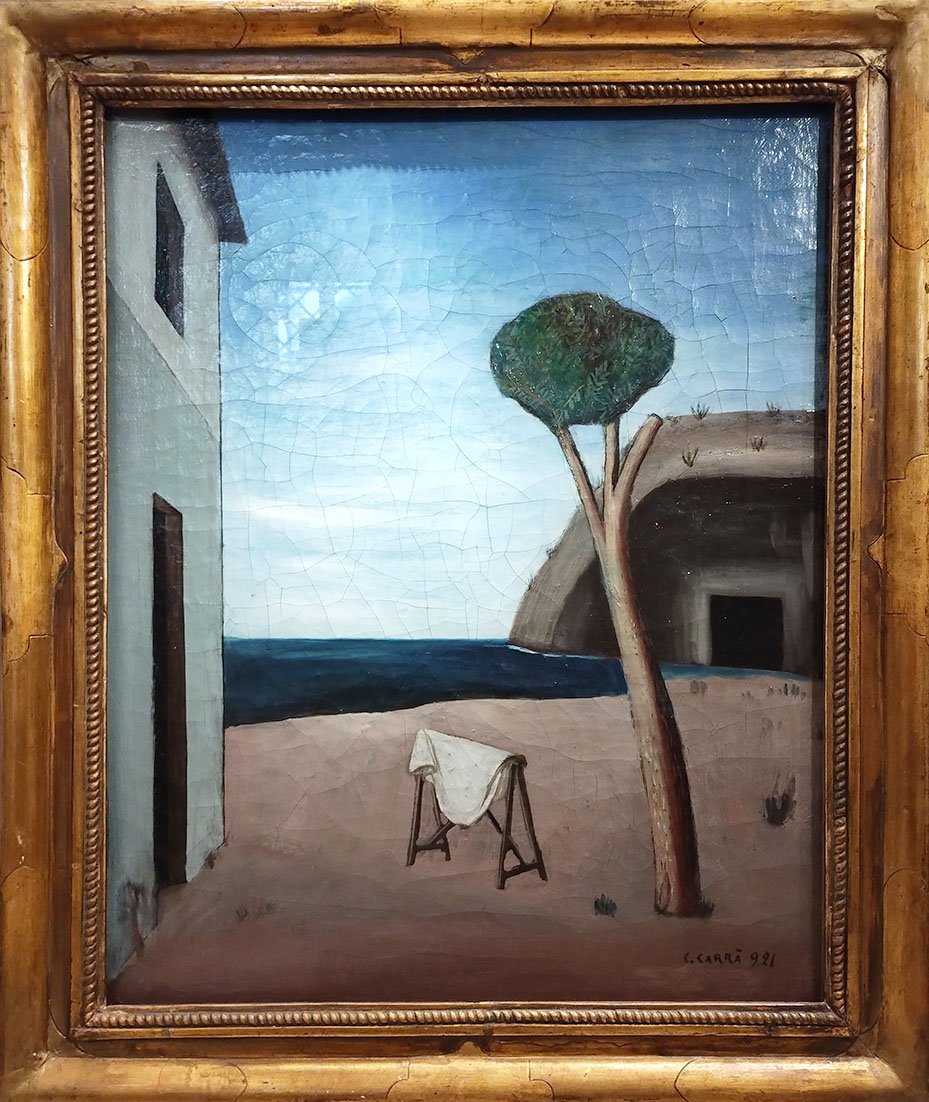 Además de la fundamental exhibición de las revistas, como comenté, la exposición colgó pinturas, como Pino sul mare, óleo de Carlo Carrá de 1921. Leo en la cartela de exhibición: «"Ya no albergo ningún tipo de prejuicio. Vuelvo a las formas primitivas y concretas. Me siento como el Giotto de mi época”, escribió Carrà a Papini en junio de 1915, manifestando su adhesión a un nuevo modelo de simplificación formal que estaba para definirse aún más en los años de la posguerra en cuadros de capital importancia como Pino junto al mar, antiguamente propiedad del músico Aldredo Casella». Y pensé: ¡Alfredo Casella!, el autor del gran tratado La técnica de la orquesta contemporánea que día y noche vuelvo a consultar, desde hace años, y que ocupa un lugar privilegiado sobre mi piano.