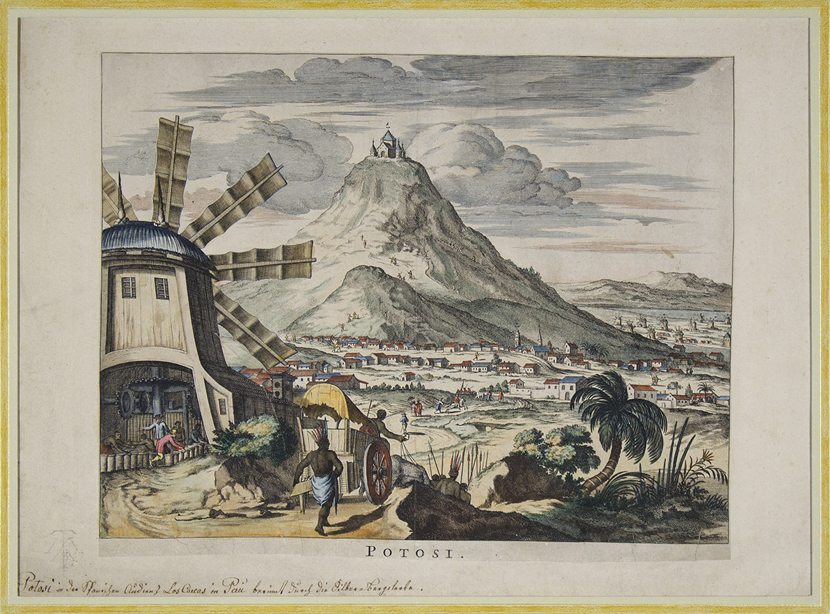 Grabado holandés con el Cerro Rico y a sus pies, la ciudad de Potosí. Apreciemos la mirada fantasiosa de Europa sobre nuestra América profunda. Impreso hacia 1728.