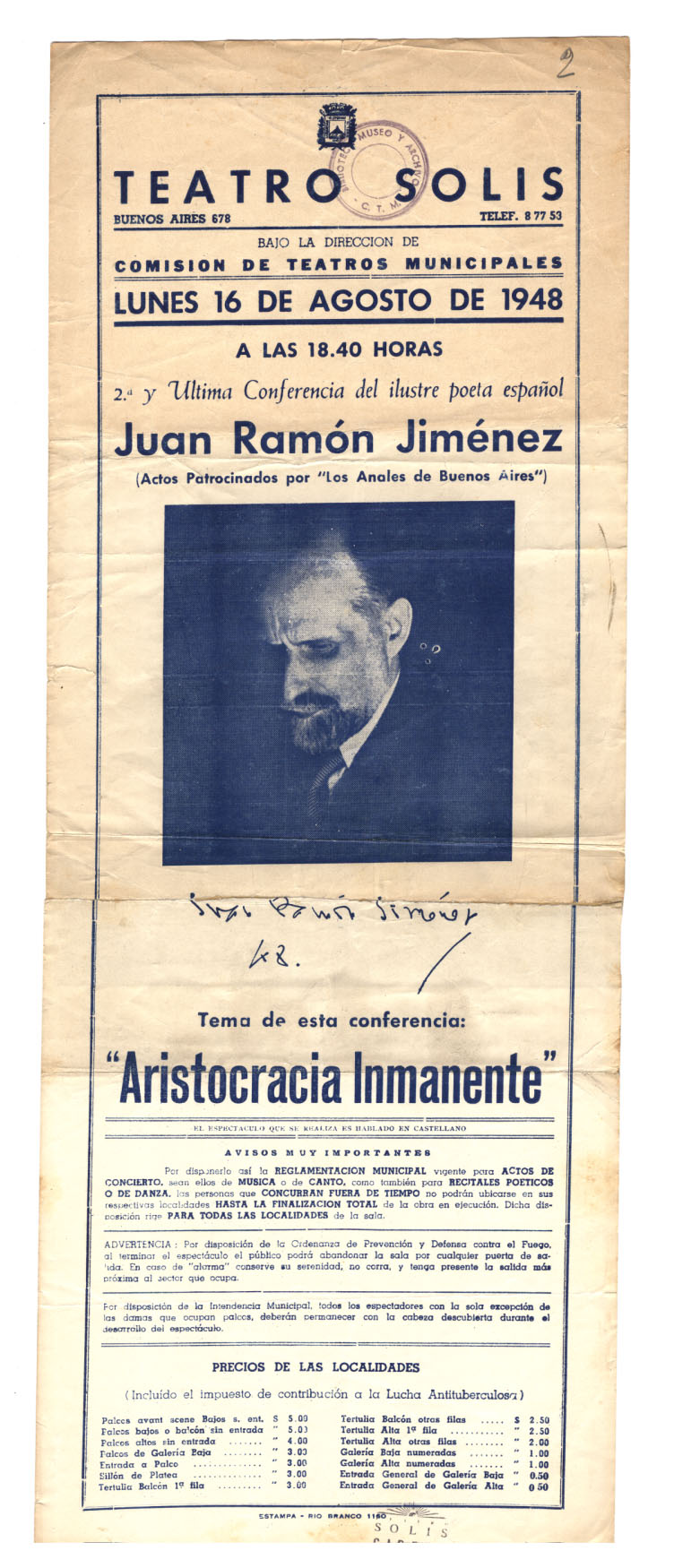 En esos días en Buenos Aires, entre el 9 de agosto y el 4 de septiembre, Juan Ramón leyó cuatro conferencias, ofreció entrevistas a distintos periódicos, visitó las redacciones de los diarios La Nación y de La Prensa, y fue objeto de distintos homenajes, como el que organizó la Sociedad Argentina de Escritores (SADE) el 18 de agosto de 1948.