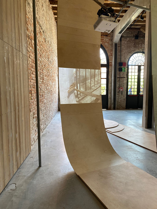 En el pabellón argentino, Luciana Lamothe despliega una estructura curvilínea de madera terciada y pulida que nos hace evocar la idea de infinito, atravesada por troncos, elementos punzantes, accidentes que evocan violencias y quiebres que sin embargo no impiden su suave presencia y la invitación a compartir ese espacio. “Ojalá se abran todas las puertas” se llama esa instalación en la que se ven y escuchan videos en los que la artista destruye puertas a martillazos y que nos dan una bella clave de interpretación: Argentina abriendo siempre las puertas, como país de extranjeros, una camada sobre otra, siempre dispuestos y generosos con los nuevos. Ojalá esa larga tradición no se termine y se sigan abriendo todas las puertas…