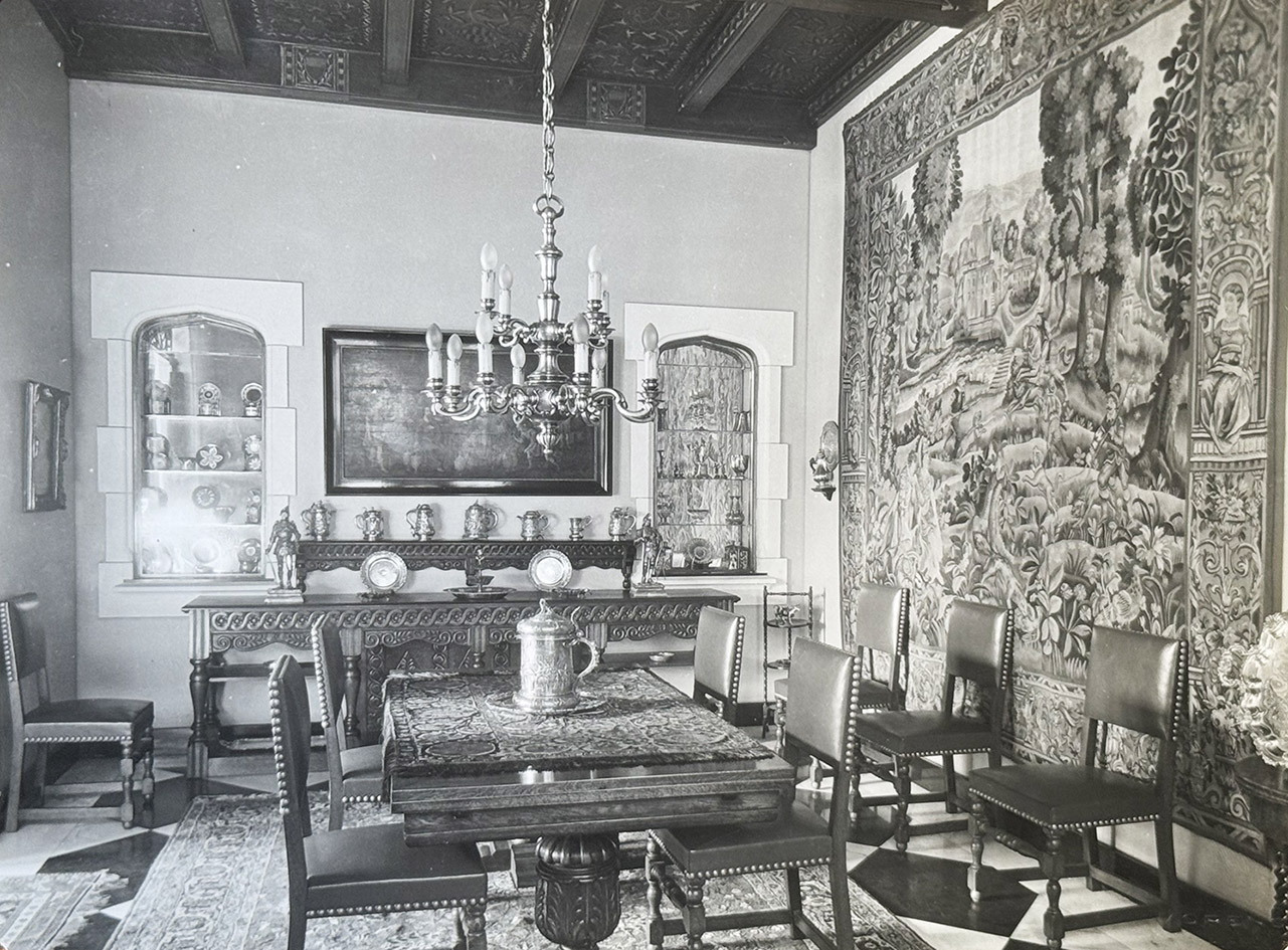 En las paredes, también lo testimonian estas fotografías, colgaban otros cuadros, entre ellos se destaca una monumental obra holandesa del siglo XVII mostrando el retrato de una familia, que debió medir casi tres metros de ancho. Reinaba en el descanso de la escalera principal, sobre una biblioteca en donde todo fue hecho a medida. En el resto de los ambientes hay tapices franceses, alfombras sobre el mármol de los pisos [en el dormitorio el piso de roble era de gran delicadeza], pequeñas esculturas, bibelots, marfiles, vitrinas, objetos provenientes de Oriente y otros cuadros, en un gusto ecléctico anticuado para la época ya que era el que cultivaban los coleccionistas del siglo XIX. Algunos muebles son de calidad, hubo caoba y marquetería, aunque en algunos se advierte su manufactura local, y nada destacable. A diferencia de otros coleccionistas, el conjunto que se observa era una reunión de objetos sin una guía, sin ese algo que transforma un conjunto en una verdadera colección. Varias pero no todas las pinturas son antiguas y de calidad, en la sala se destaca una tenebrosa Vanitas con el infaltable cráneo llamando a la humanidad a dejar sus veleidades mundanas. Sobre la chimenea hay una gran marina que parece haber sido comprada en función del tamaño y no por su calidad. Hay detalles, como el enorme tapiz del comedor, que es evidente que llegó desde un espacio mayor en donde se exhibía con más propiedad.