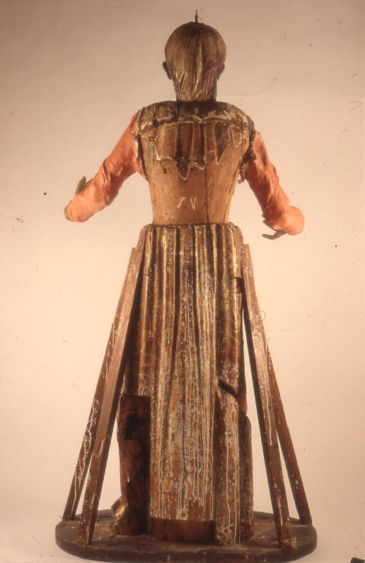 Poco y nada se sabía de ella. Con autorización de los padres dominicos pudimos desvestirla y comprobar como una tela moderna y de color rosado, cubría toda la pieza desde la cintura hasta la base. La cabeza había sido desbastada, quitándole parte del cabello y el velo que lo cubría. Las manos auténticas, habían sido cortadas a la altura de los puños conservando el borde del vestido de las manos originales.