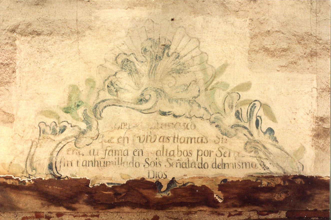 Por último, quiero hacer referencia al descubrimiento de la pintura mural del siglo XVII y XVIII, en el refectorio viejo y sin uso del convento de San Francisco, en el centro de la ciudad de Córdoba. El mural estaba tapado por una enorme pintura que bajamos en el año 1989 para documentar y restaurar. Bajo ella se encontraba la cartela preservada sin las sucesivas capas de cal con que había sido pintado todo el refectorio en diversas épocas. Todo el salón tenía pinturas murales que se fueron descubriendo a medida que avanzaron los planes de restauración bajo la dirección del mexicano Rodolfo Vallín. Los temas son variados: floreros, fruteras, guirnaldas, un zócalo que remeda azulejos, etc. La cartela que estaba tapada por la pintura al óleo que retiramos, tiene como remate una venera y un marco azul y verde. Dentro de ella se lee: «Noble San Francisco, que vivas llamas suena tu fama en altavoz, por serafín tan humillado sois señalado por el mismo Dios». (Ver fotografía)