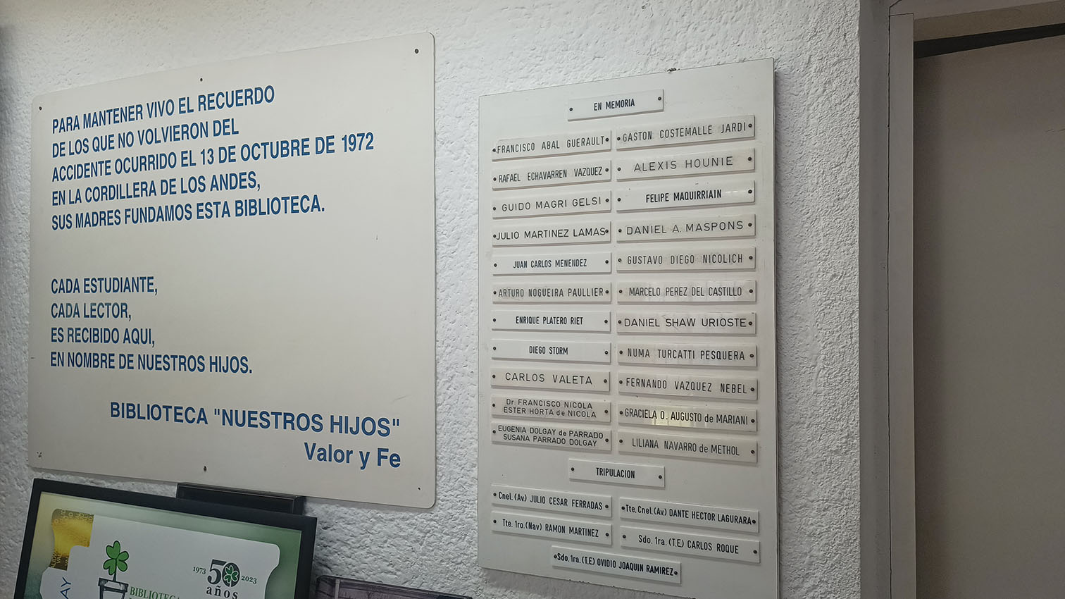 «En sus inicios la biblioteca fue su tabla de salvación. Fue el esfuerzo de un grupo de señoras que se reunió para volcar su dolor en algo positivo. Quisieron reunirse y ver qué hacer. Finalmente decidieron hacer una biblioteca estudiantil, porque una de ellas era profesora de liceo y porque todos sus hijos eran estudiantes», cuenta Stella Pérez del Castillo, integrante de la Comisión Directiva. Ella es la hermana de Marcelo Pérez del Castillo, capitán del equipo de rugby Old Christians, el responsable de organizar el viaje, el primer sostén espiritual del grupo al momento del accidente, fallecido a los 25 años cuando el alud del 29 de octubre sepultó al fuselaje. Dos días antes, una vidente le había dicho a su madre, su tía y una amiga de ellas que estaba vivo pero que había que rescatarlo «ya». Ella se emociona con ese recuerdo.