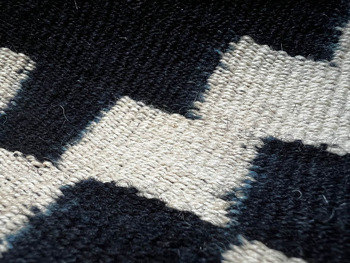 El mismo modelo romboidal, pero presentando análoga formación en tres secciones separadas y siguiendo dos líneas de figuras, inscripta una en la otra, nos ofrece otro poncho que puede observarse en el mismo Museo de Azul, pero más reciente que el anterior, pues data de 1925, y sin más colores que el negro del teñido del fondo y el blanco natural de la lana que diseña el dibujo.