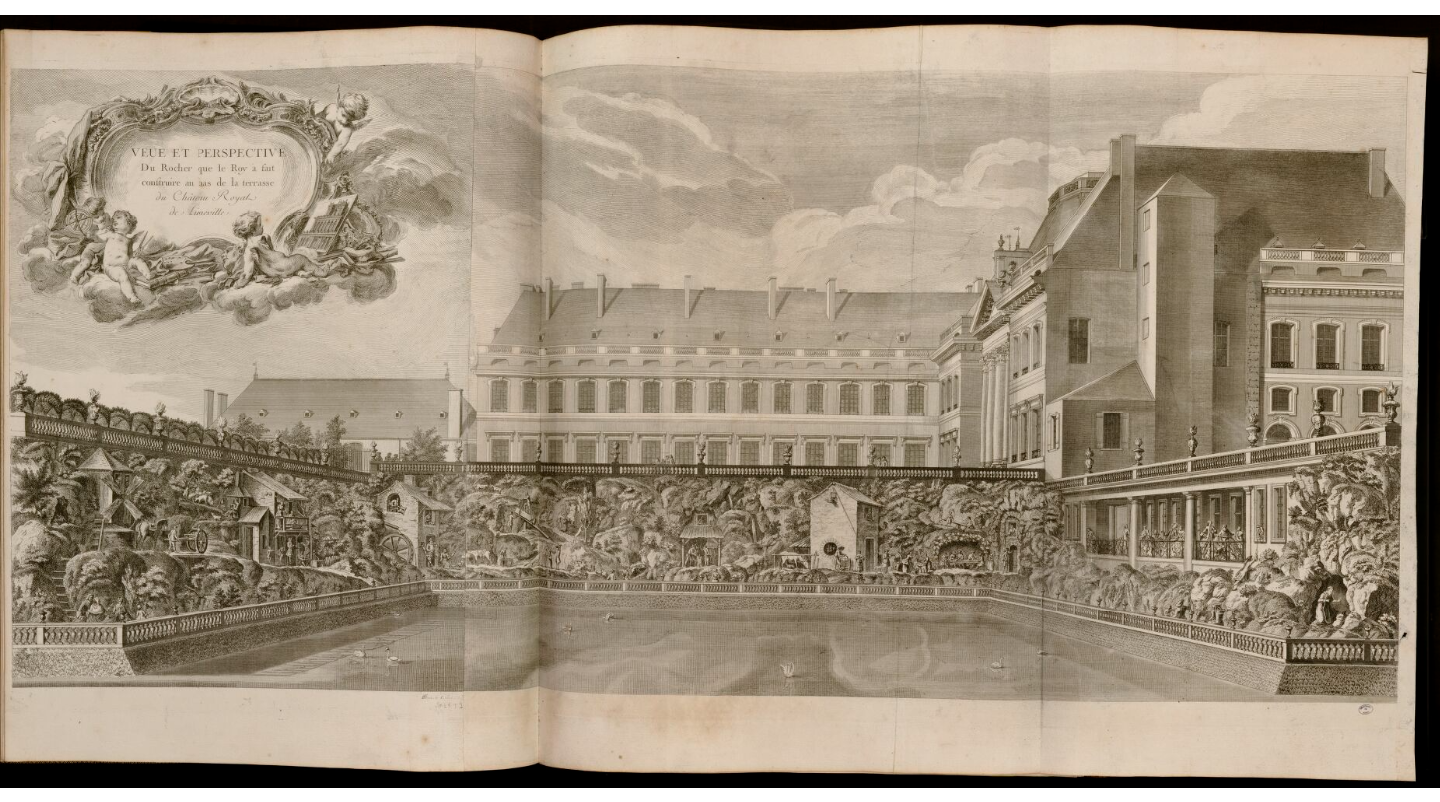The world of the 18th century was amazed by these things. Thus, in 1742 and near Nancy, the architect Emmanuel Héré de Corny (1705-1763), had built an “Artificial Rock” or “Rocher de Lunéville” against the retaining wall of the northern terrace of the castle of the King of Poland and Grand Duke of Lithuania Stanislas Lecszcinsky (1677-1766), along the Grand Canal. Héré dedicated several pages to it in his "Recueil des plans, élévations et coupes... des châteaux et dépendances que le Roi de Pologne occupe en Lorraine" (see image) published in 1752. In this setting composed of rocks and caves, 88 were installed automata that represented characters and scenes from everyday life and that worked thanks to cables set in motion by a hydraulic system. The mechanical parts had been created by François Richard, the duke's watchmaker and plumber. Famous in its time, the Rocher contributed to the renown of Stanislas Castle. It formed a kind of mountainous landscape made of sandstone blocks and arranged in a U shape for about 250 meters. On the west side, there was a balustrade with a balcony supported by Tuscan columns, from where the courtiers observed the complex and the moving automatons. On it, some wooden or brick buildings were located, such as a mill, an inn and a barn, scenes of rural life could be seen. The automatons were flat cardboard figures representing various occupations such as miller, shepherd, carder, blacksmith, sharpener, carter, washerwoman, peasant, musician, soldier, as well as children in a hammock, a hermit praying and numerous animals: horse, dog, cat, sheep, rat, chickens, goat, cow, pigeons and a monkey. At the ends of the U, four openings were hollowed out, simulating grottoes, with a trompe-l'oeil painting at the bottom. It is known from two iconographic sources: the Recueil and a painting attributed to André Joly (1706 - 1781), preserved in the Lorraine museum, a territory that after the war of Austrian succession had been awarded to the Duke.