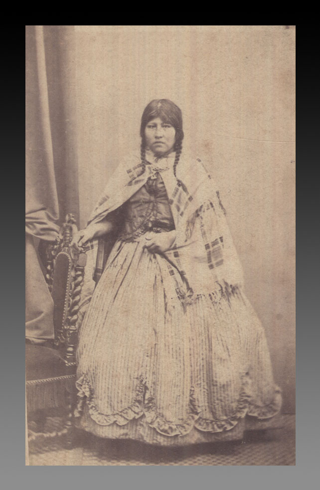 Durante la estadía uruguaya confirmamos ahora, que Biguá y su inseparable Juana fueron retratados por el reconocido estudio Jouant. Una de las fotografías vintage conservadas en la Biblioteca Nacional de Uruguay en Montevideo - otro ejemplar de la toma publicada en el número anterior de Hilario - se encuentra montada sobre el soporte secundario original, una cartulina blanca impresa litográficamente en tono oro de la firma Jouant Hermanos [4] y las otras dos, nueva sorpresa, distintas a las que dieran origen a nuestro artículo anterior. Este nuevo hallazgo refuerza la idea del carácter especial de su viaje. En una de ellas observamos al jefe tehuelche vestido con el uniforme militar argentino -con las insignias de capitán y la gorra de caballería utilizada con frecuencia por los llamados «indios amigos» [5] - y en la restante, a su hija, con ropa urbana de uso en la época. Esta transculturización tehuelche ejemplificada a través de la veraz imagen fotográfica, merece un mayor estudio de nuestra parte... que dejamos para más adelante. El mobiliario de ambos registros nos indica que todas las tomas fueron realizadas en la galería de pose del estudio de la casa Jouant Hnos, cuando ésta ya se encontraba ubicada en calle Ituzaingó N. 139, esquina Rincón, de la ciudad de Montevideo. El pedestal tipo columna, la silla con respaldo salomónico, la alfombra floreada, el pesado cortinado y el fondo liso y neutro para resaltar las figuras y observable en toda la serie, alude también a una única sesión donde los retratados variaron su vestimenta con el objetivo de mostrar sus dos facetas culturales y sociales.