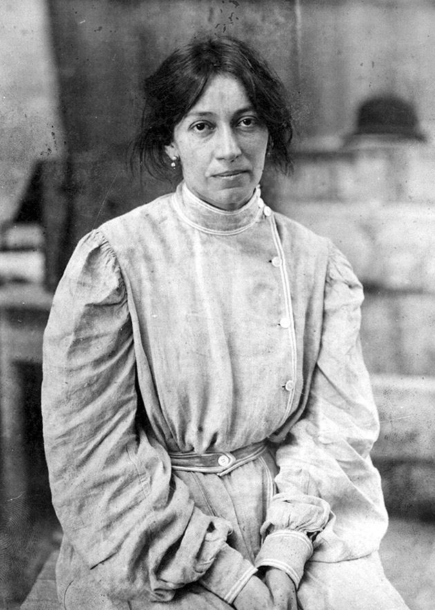 Lola Mora trabajando en su taller frente a un modelo. Roma, 1905.