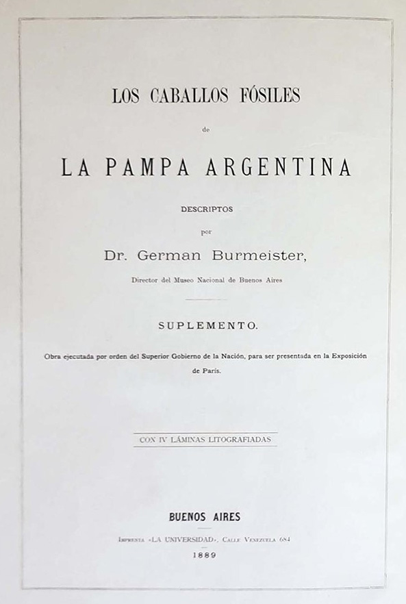 In 1875, Hermann Burmeister (1807-1892), former professor of zoology at the University of Halle and, since 1862, director of the Public Museum of the Province of Buenos Aires, published Los caballos fossils de la Pampa Argentina, a work printed by order of the government. It was intended to be displayed at the World's Fair in Philadelphia, an event that would take place between May 10 and November 10, 1876 to commemorate the centennial of the American declaration of independence.