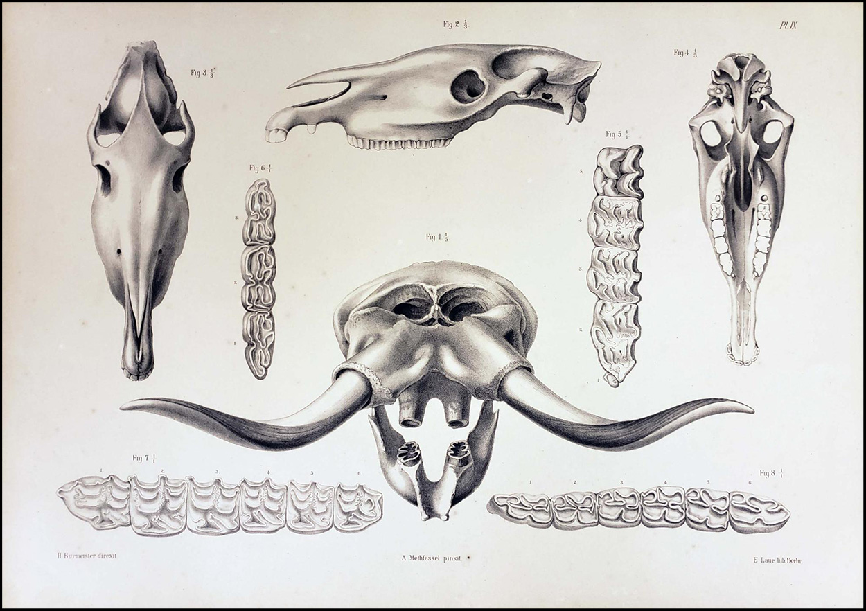 Carl Friedrich Schmidt (1811-1890), for his part, had specialized in producing botanical lithographs in collaboration with Otto Karl Berg, professor of plant medicine at the University of Berlin. Some think that he was the owner of the photography studio that operated with that name in Halberstadt, a city in Saxony-Anhalt. As it was, unlike the monograph on the glyptodonts, Burmeister resorted to a draftsman from Buenos Aires, but he sent the lithographic plates to Berlin to be made.