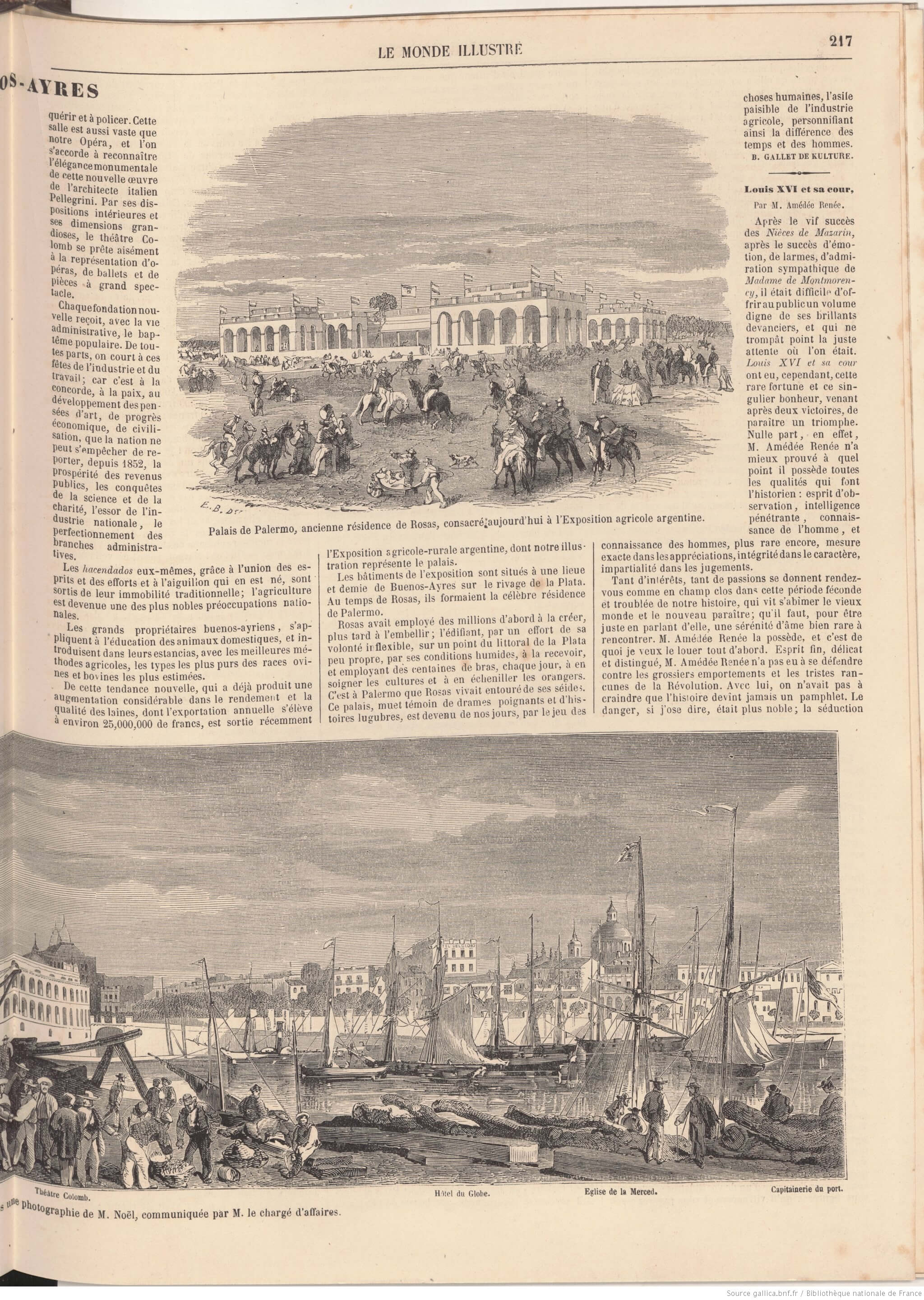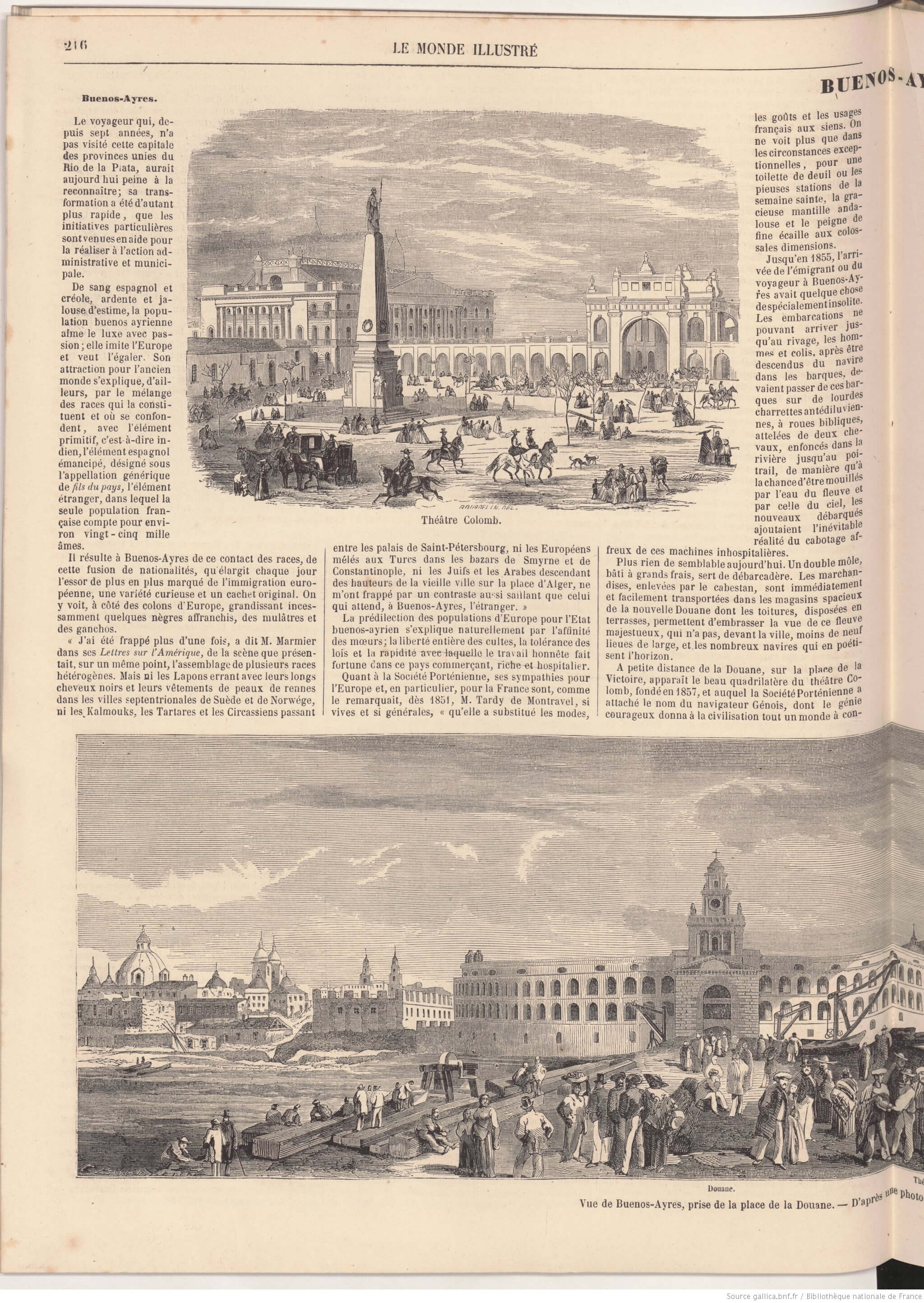 Si comparamos la acuarela con la ilustración de Bourdelin publicada en Le Monde Illustré que ocupa el sector inferior de la doble página con su artículo titulado “Buenos Aires”, es posible indicar dos aspectos que motivan a pensar que es su fuente: en la representación de la Aduana Nueva por Le Breton se observa una leve curva en la fachada frente al río que rompe el semicírculo de la plataforma, coincidente con la imagen editada en la revista francesa; el segundo es que ubica detrás de ese edificio –delante para la ciudad- una arquitectura que parece reunir confusamente la Catedral y la torre del Cabildo, con cierta invención arquitectónica, acorde con la escasa definición en ese sector en Le Monde Illustré. En la acuarela se observan, además, las iglesias de San Ignacio y La Merced, el Hotel del Globo y la Capitanía del Puerto.
