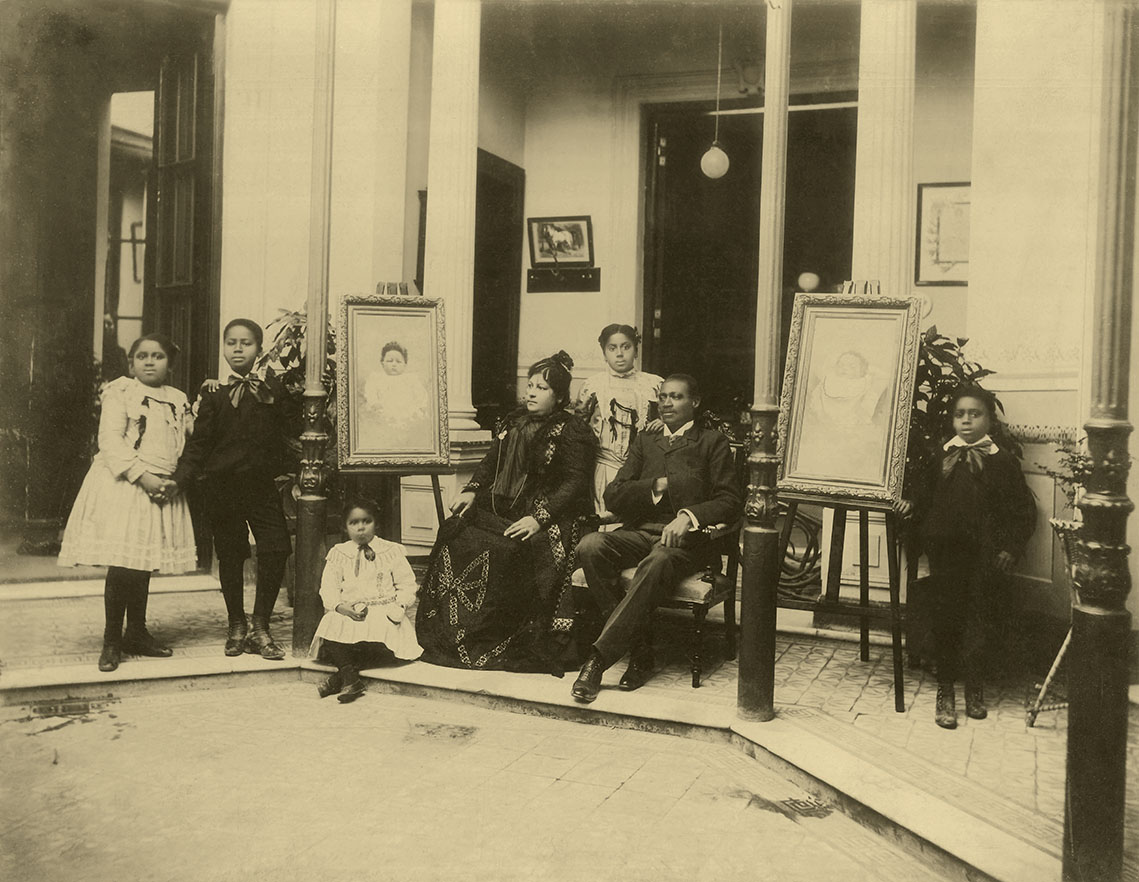 La familia Platero viva, en cuerpo y en espíritu (los retratos que se ven sobre los atriles pertenecen a dos de sus hijos recientemente fallecidos), en su casa. La Plata, 1903.