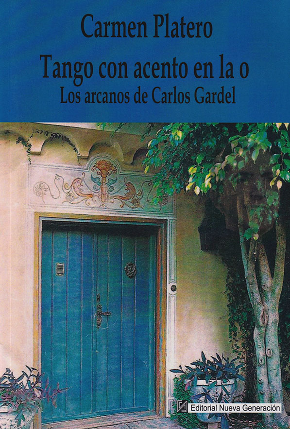 Portada de la novela Tango con acento en la o : Los arcanos de Carlos Gardel, de Carmen Platero (Buenos Aires, Nueva Generación, 2017).