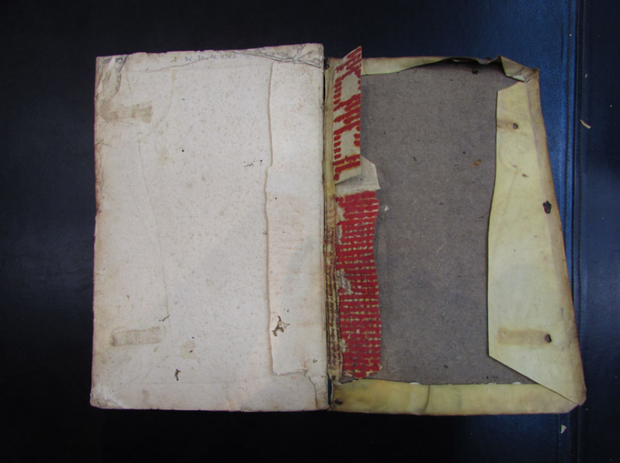 1. En este ejemplo, el manuscrito desechado primero se usó como insumo de impresión (para imprimir a color, como hoja de frasqueta) y después como insumo de encuadernación.