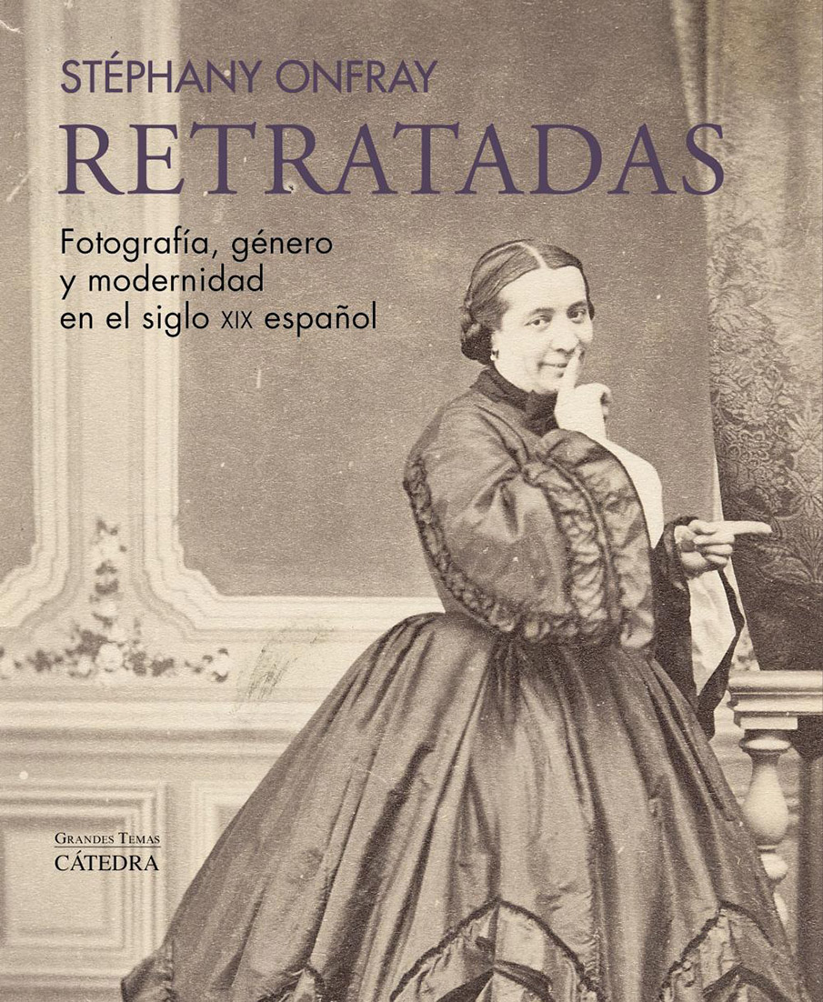 Intenté plasmar esta idea en la portada de mi libro Retratadas. Fotografía, género y modernidad en el siglo XIX español [Cátedra, 2025], donde desarrollo el aparato teórico que sostiene la exposición y que, a su vez, funciona como catálogo de la misma. En ella, una mujer rompe la cuarta pared —simbolizada por la cámara y el fotógrafo— y se dirige al espectador, a quien convierte en cómplice del engaño.
