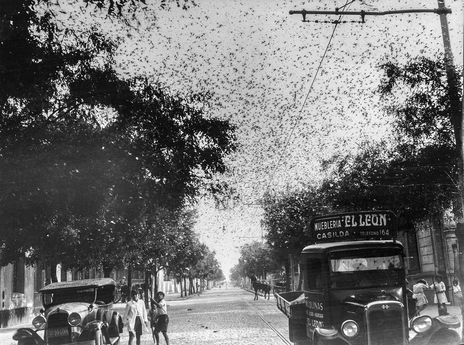 Una manga de langostas sobrevuela por sobre una calle de Casilda, provincia de Santa Fe. Década de 1940. Fotografía: Archivo General de la Nación. En Internet: VER