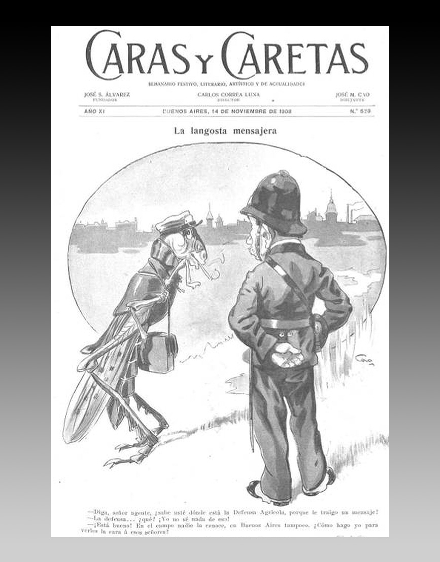 En ese contexto, estos insectos se convirtieron en un tema creciente en las revistas y periódicos nacionales. «Caras y Caretas», por ejemplo, publicaba frecuentemente noticias, caricaturas y misceláneas, junto con artículos de divulgación científica sobre este tema. Inicialmente, apelando al humor y a veces al sarcasmo, relacionaba el problema de la langosta con otros asuntos de la política nacional. De hecho, las diversas comisiones y subcomisiones creadas desde finales del siglo XIX en el Ministerio de Agricultura fueron sospechadas de corrupción y clientelismo político. Era muy frecuente la analogía utilizada por escritores y caricaturistas de esta revista, parangonando los daños de la corrupción política y económica con los daños causados por las plagas de langostas, equiparando a políticos, funcionarios públicos y especuladores económicos con los voraces insectos.