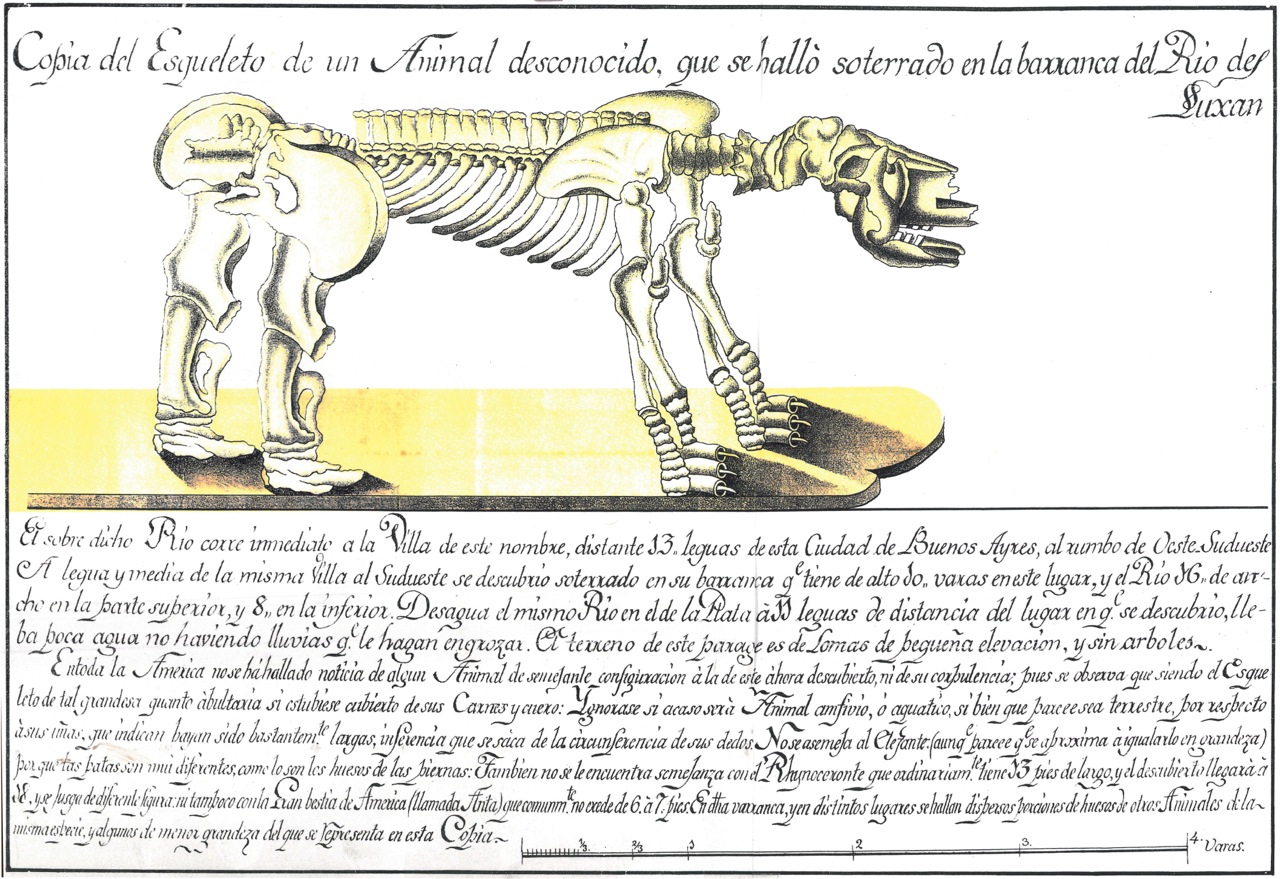Bartolomé Muñoz le envió a Dámaso A. Larrañaga el diseño del esqueleto que en 1785 se desenterró en las barrancas del río Luján y que el virrey Marqués de Loreto envió a Madrid, al Real Gabinete de Historia Natural.