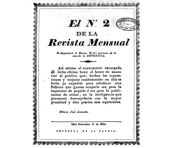 Por Gregorio A. Caro Figueroa *Lector apasionado y bibliófilo; de profesión ensayista y periodista, el autor nos sitúa en su provincia, en 1824, a través de un periódico cuasi inhallable, la Revista Mensual -denominada más adelante Revista de Salta, cuyo impresor fue el poeta Hilario Ascasubi, y su director, ildefonso Arenales. «El periódico cambió de nombre en su corta vida; su primer número, fechado el 30 de septiembre de 1824 lo hizo como la Revista Mensual, y así continuó en las tres siguientes entregas -del 20 de noviembre y 6 de diciembre, y ya en 1825, la correspondiente al 15 de enero- y ya con su nuevo nombre, Revista de Salta, los siguientes números, publicados el 22 de enero, el 5 y el 10 de febrero, y el 5 de marzo. En este último se informó a suscriptores y lectores el indispensable cese de la revista e informaba que el fallido número 9 “contenía la despedida con una manifestación de principios que han guiado nuestras tareas”».
