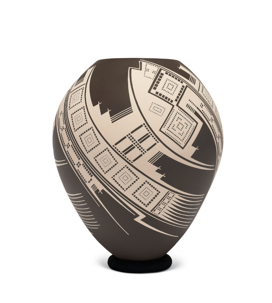 Lote 24: Paquimé Pot. Cerámica. Obra de Iván Quezada (1993), de 25,4 cm de alta y 22,9 cm de diámetro. Ejecutada en 2020.