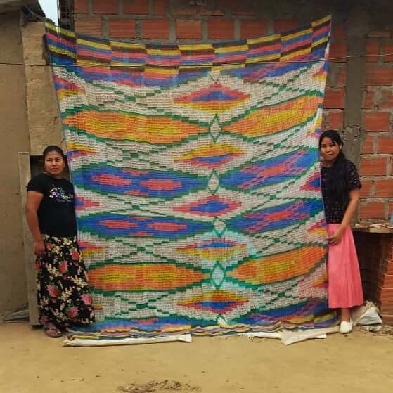 Image of the nylon fabric made by the group of women T´sinay tha´chuma´as and two of its creators -Claudia Alarcón and Edelmira Duarte-, from Wichí communities of Zona La Puntana, Salta. (2021) Photo: Eduardo Solá.