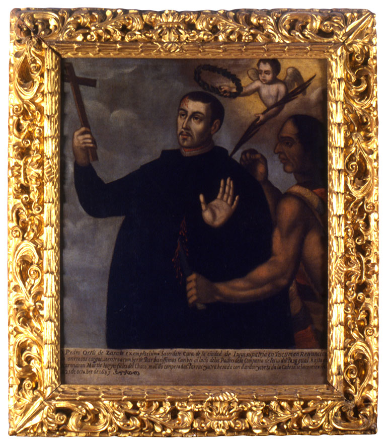 Esta pintura de óleo sobre tela, que hoy se encuentra en el Museo de Arte Colonial de Bogotá, tiene medidas de 104 x 85 cm y fue restaurada en 1984 incluyendo su cartela que manifiesta: “D. Pedro Ortis de Zarate exemplaríssimo Sacerdote Cura de la ciudad de Iujuy su patria en Tucuman Renunciando a onrrosos cargos, se entro a combertir Barbarissimos Caribes al lado de los Padres de la Compañia de Iesus del Paraguai hasta que lo coronaron Martyr los ynfieles del Chaco, molido con pesadas Porras y atrabesado con dardos y cortada la Cabesa se la comieron el 21 de octubre de 1685”.