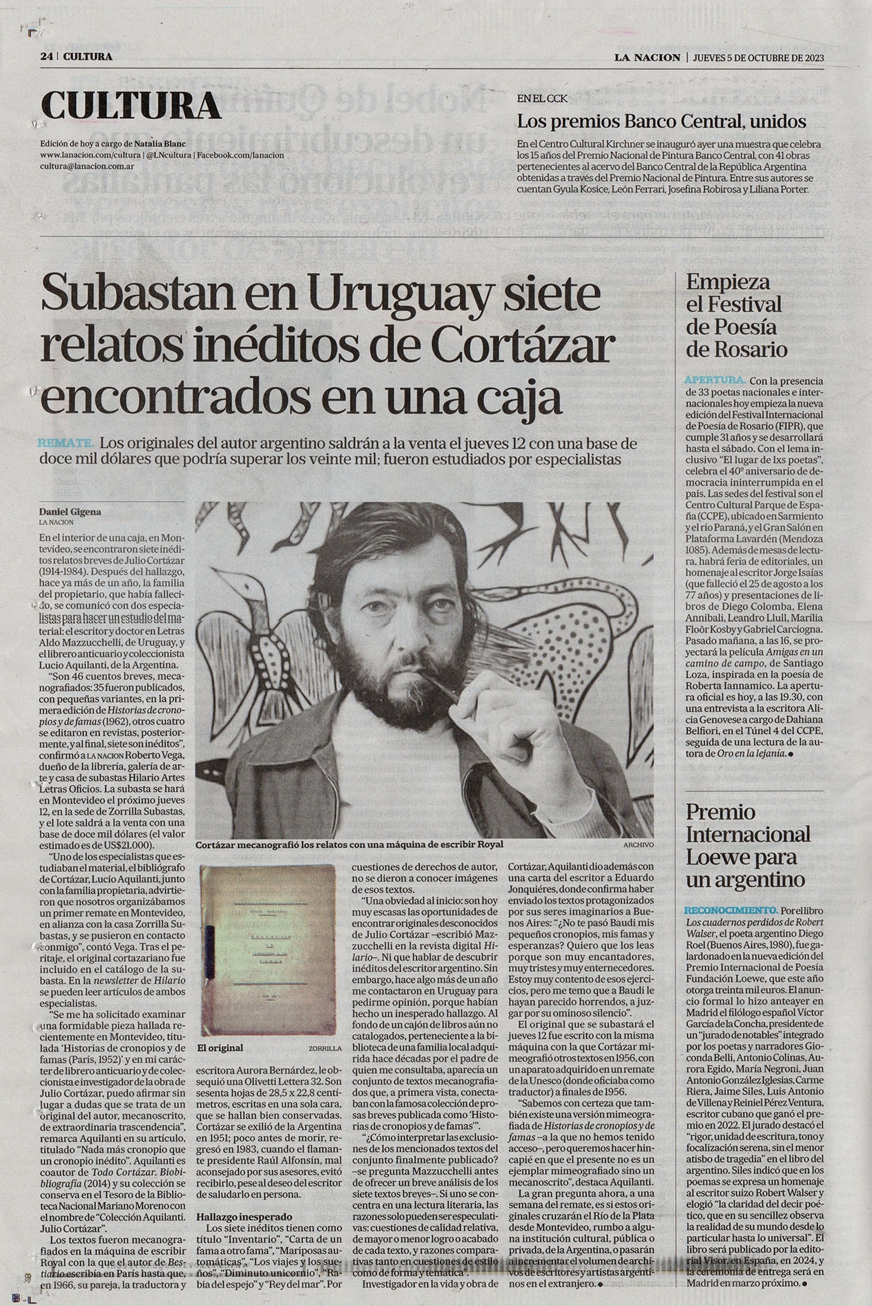 Dado que esa historia, lo expresamos, ya fue muy comentada por la prensa -antes y después de la venta-, ahora queremos detenernos en otro aspecto de aquella primera Subasta de Arte iconográfico, Libros y Documentos históricos. En especial pretendemos sacar a la luz el comportamiento de ambos Estados nacionales rioplatenses. Las autoridades argentinas del Ministerio de Cultura de la Nación, interesadas por el tesoro cortazariano, buscaron arduamente la manera de participar en la subasta y luego de explorar caminos junto a sus pares uruguayos, decidieron hacerlo de modo directo, vía telefónica. Desde la organización del remate me cupo la responsabilidad de allanar la ruta para que esto fuera posible y desde los interesados, encontramos toda la predisposición para cumplir con los requisitos mínimos. Y allí estuvieron al teléfono buscando acrecentar el patrimonio público argentino con tan hermosa pieza literaria. Pero el precio excedió sus posibilidades y no pudo ser. La pronta decisión, el gesto, merece el reconocimiento, lo intentaron y en medio de una situación muy compleja para la economía argentina. Todo es muy meritorio.