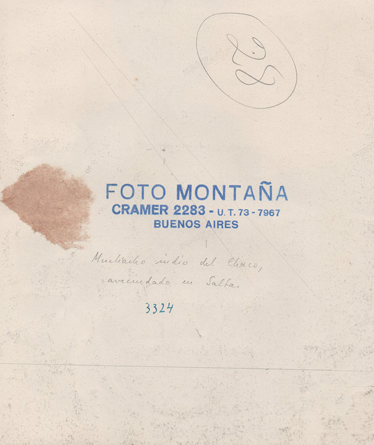 Obra fotográfica vintage, copia a la gelatina de plata. Al dorso de la imagen un sello húmedo autoral en tinta azul: FOTO MONTAÑA. CRAMER 2283 - u. t. 73 - 7967. BUENOS AIRES”, y en forma manuscrita, la leyenda “Muchacho indio del Chaco avecindado en Salta”, más el número del negativo: 3324. Medidas: 21,5 x 18,2 cm.