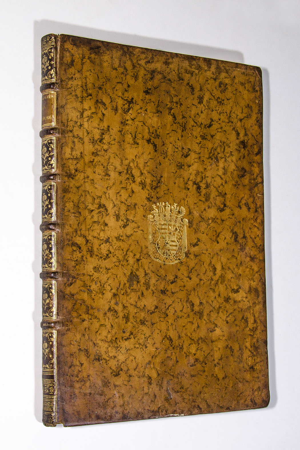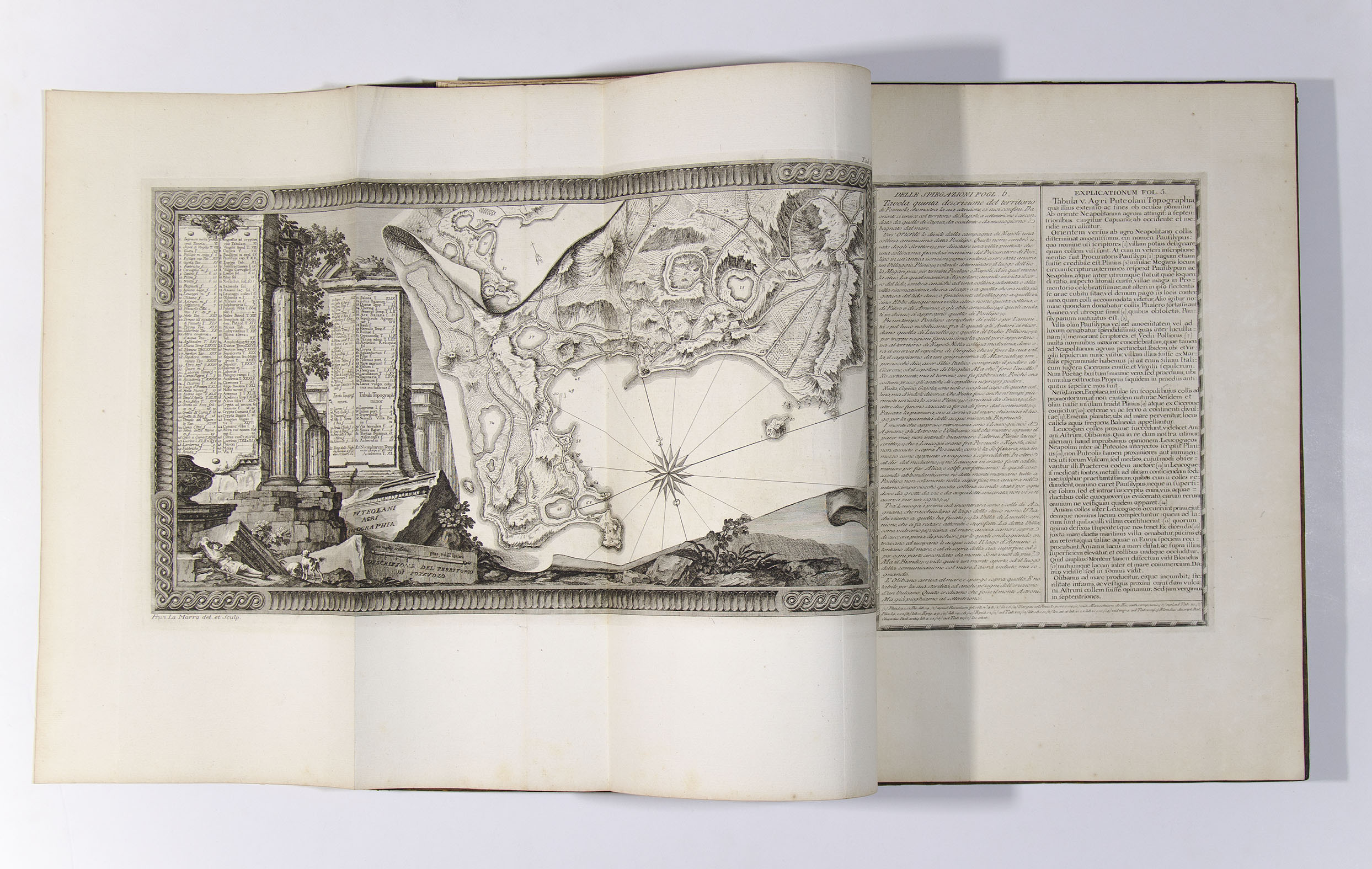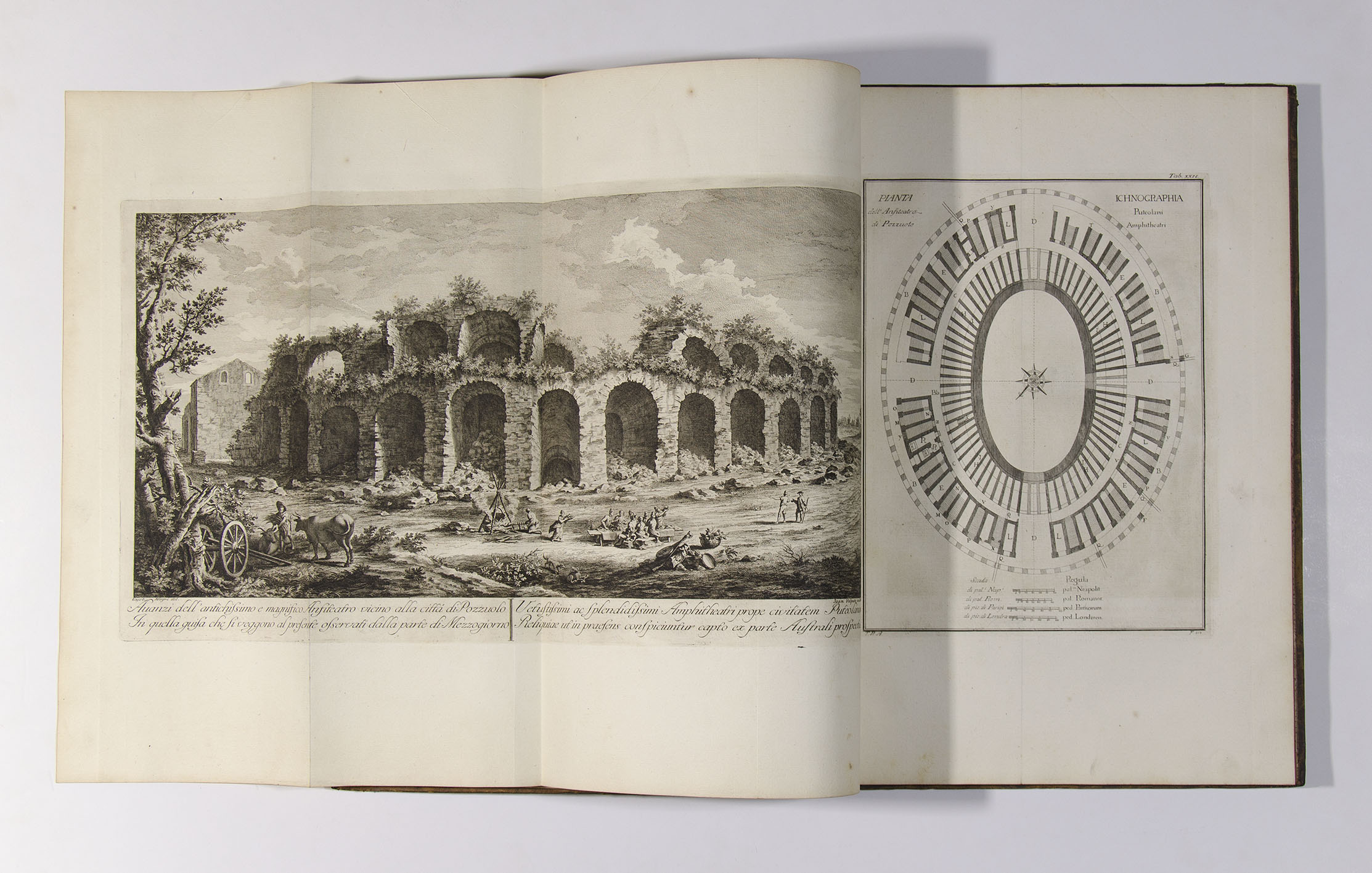 Obra capital de la imprenta italiana del siglo XVIII. En Folio (50 x 35,5 cm), con Frontis litográfico, 36 páginas de texto en dos columnas, en italiano y latín, 2 pp., de Índice, + 68 láminas -la número II, la Portada- con vistas y planos, algunas plegadas. Preciosa encuadernación en pleno cuero con armas, lomo con nervios y títulos dorados. Ejemplar en buen estado.