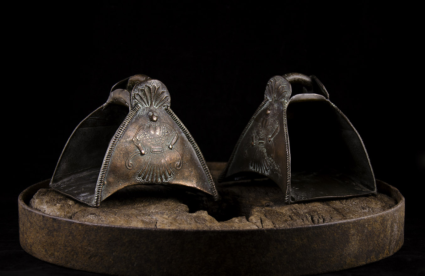 Los estribos tipo cajón o baúl -en algunas variantes llamados de medio celemín-, fueron muy utilizados por los jinetes vaqueros de la Península Ibérica -España y Portugal-, evitando así los riesgos de las cornadas de las reses bravas, o en las guerras protegiéndose de los lanzazos del enemigo. Los había de madera con avíos de hierro, todos de hierro y también, de bronce. Este par posee una bella resolución plástica con la representación antropomorfa y de veneras, las que también decoran la solapa que cubre el eje donde se sujetan a la estribera o ación.