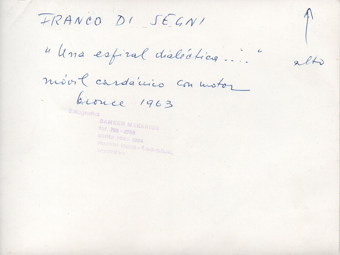 Gelatina de plata, medidas 14,2 x 19 cm. Al dorso sello húmedo “Fotografía: Sameer Makarius. tel 795 - 2768. Santa Rosa 1964. Vicente López - f.c.n.g.b.m. Argentina”. Escrito en bolígrafo: “Franco di Segni “Una espiral dialéctica…” móvil cardánico con motor. Bronce 1963”.