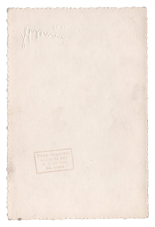 Obra fotográfica vintage. Copia en papel a la gelatina de plata. Borde artístico dentado. Tono: Blanco y negro. Al dorso sello húmedo rectangular en tinta roja y con la siguiente publicidad: "Foto Wilensky. Santa Fe 997. U. T. 41-0441. Bs. Aires". Existe además otro sello seco de tipo autoral y con la firma hológrafa: "Wilenski". Medidas: 14,6 x 10 cm. Obra en buen estado.