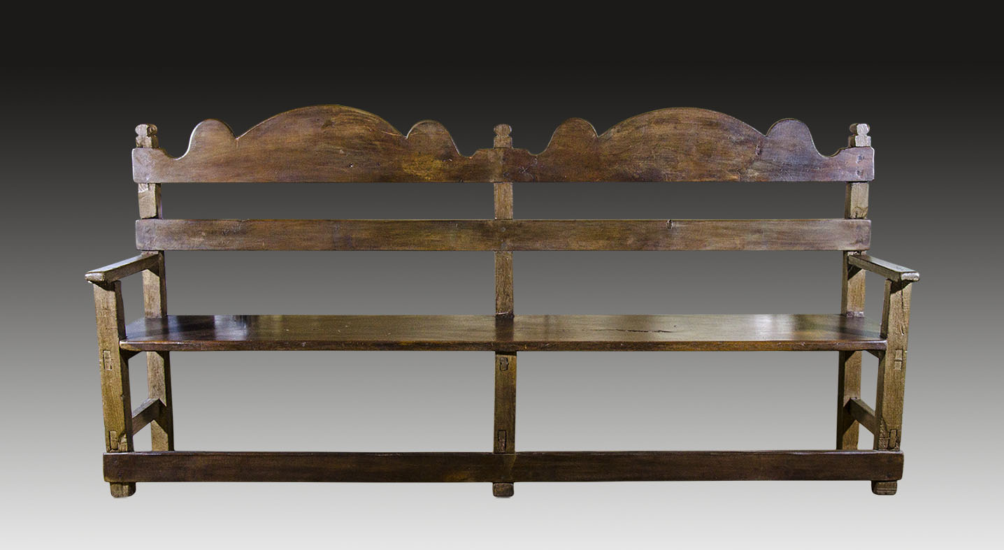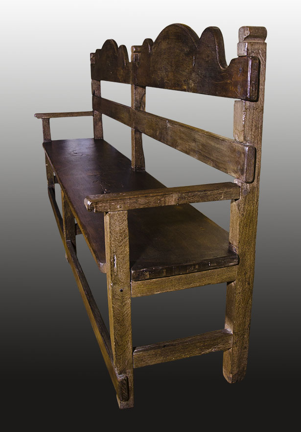 Los suntuosos escaños europeos derivaron en la Argentina profunda en muebles afines de líneas simples, funcionales, sólidos, encantadores en su austeridad. Este es el caso de nuestro banco de cuatro asientos, un típico escaño de factura criolla. Su respaldo, recto y alto, se cierra con líneas onduladas y simétricas en el único detalle curvo de la pieza.
