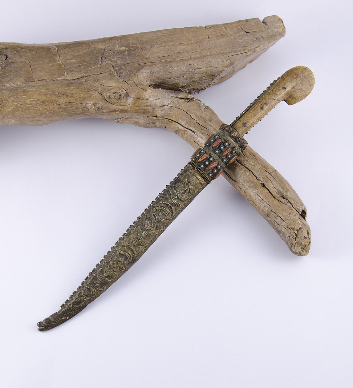 Importante cuchillo otomano con su vaina cuyo interior es de madera y se encuentra forrada por una lámina metálica -¿latón?- estampada, repujada, cincelada y calada con motivos fitomorfos y un dragón hacia la punta, y con la bocavaina decorada con cabuchones engarzados, los que además recorren el lomo de la funda. Su empuñadura, también ornamentada con piedras, se forma con dos cachas de hueso -con un cuerpo central metálico que las une, con cabuchones que decoran-; el cabo finaliza en una especie de doble oreja.